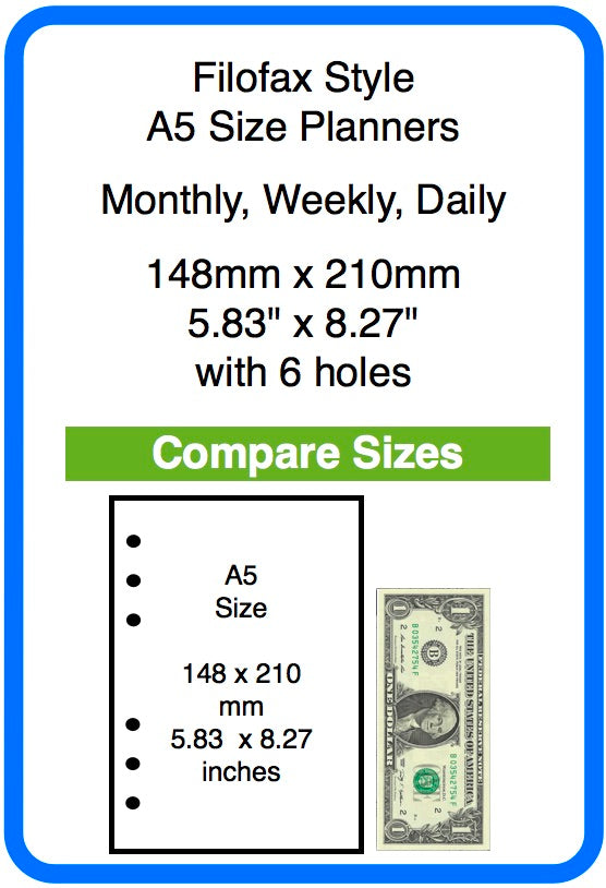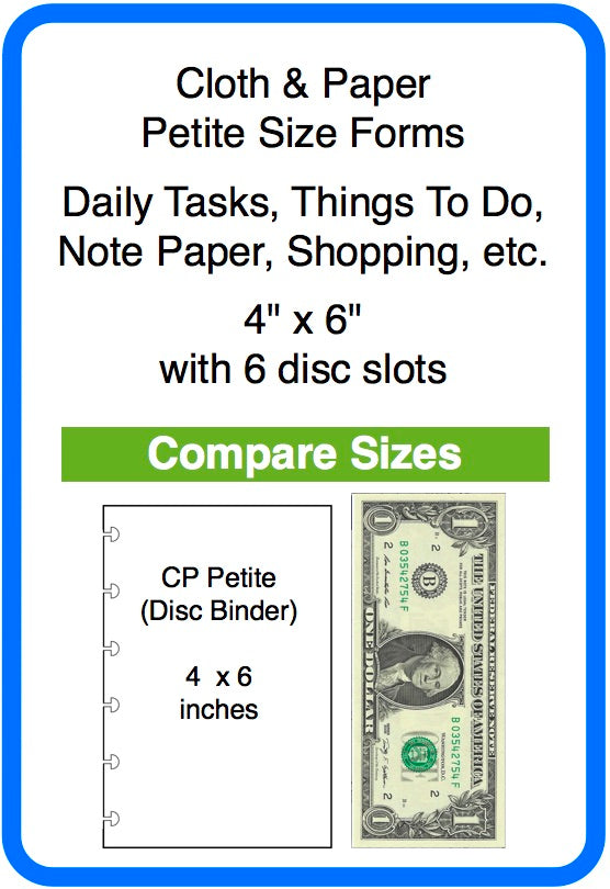To select products, click the menu above or browse through the categories below to choose the planner or form you need. Planners are dated and include daily, weekly and monthly choices. Forms help organize your things to do, shopping, meal planning, notes, doodles, whatever. Each category shows an image comparing the page size to a US dollar bill. This simple comparison helps separate the various pages which otherwise may look similar.