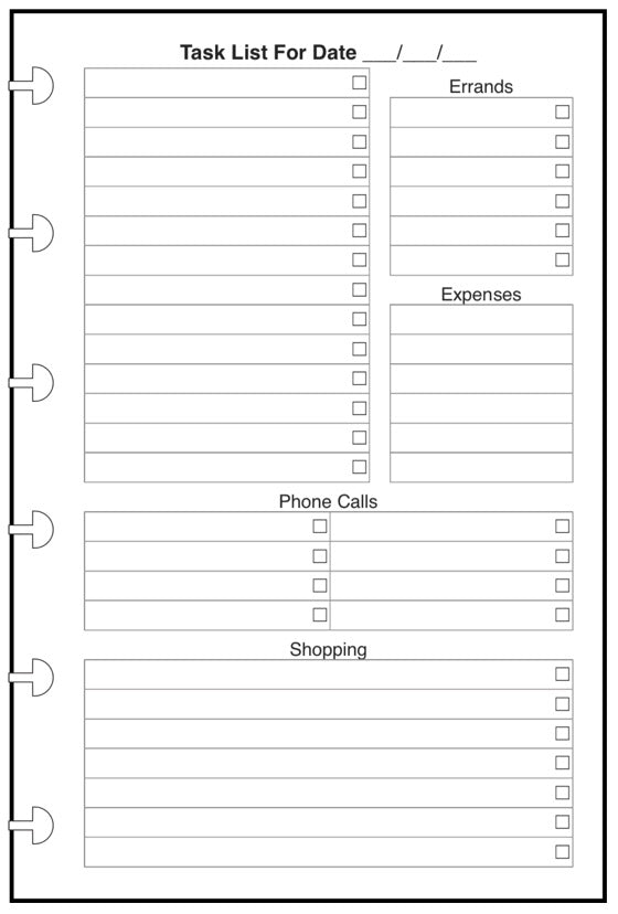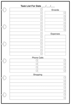 • Daily Task Planner for the CP Petite size notebook, including to-do list, errands, phone calls, shopping and expenses.