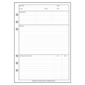 This is a helpful Meeting Planner and Organizer for the A5 size notebook. This handy form is ideal to help organize and document meetings. Included are spaces for date, time, and location of the meeting, the attendees, the meeting agenda, actions and follow-up including who is responsible. The reverse side of the form is for discussion notes.