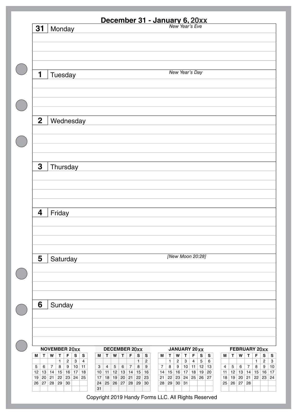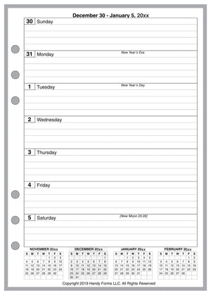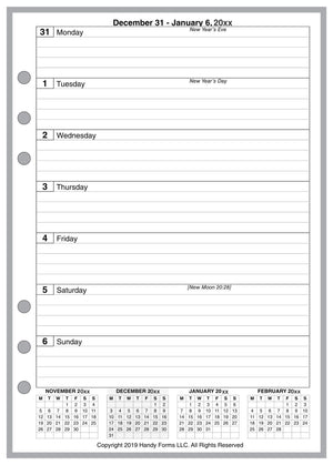 This is a weekly and monthly planner insert for A5 standard size notebooks. Page size is A5 standard, 5.83in x 8.27in (148mm x 210mm). Choose the week start day as Sunday or Monday. Each week is on one page, with separate blocks for each day. There are 4 lines for writing in each daily block. There are 3 mini-reference calendars across the bottom of each page for the previous, current, and following month.