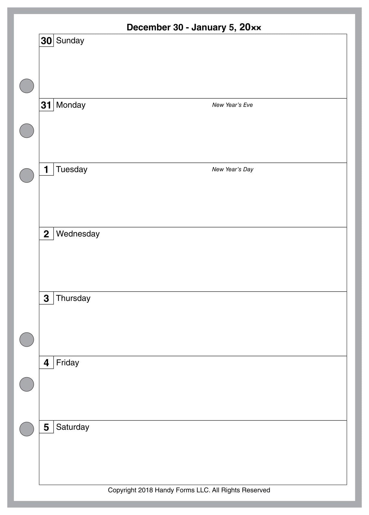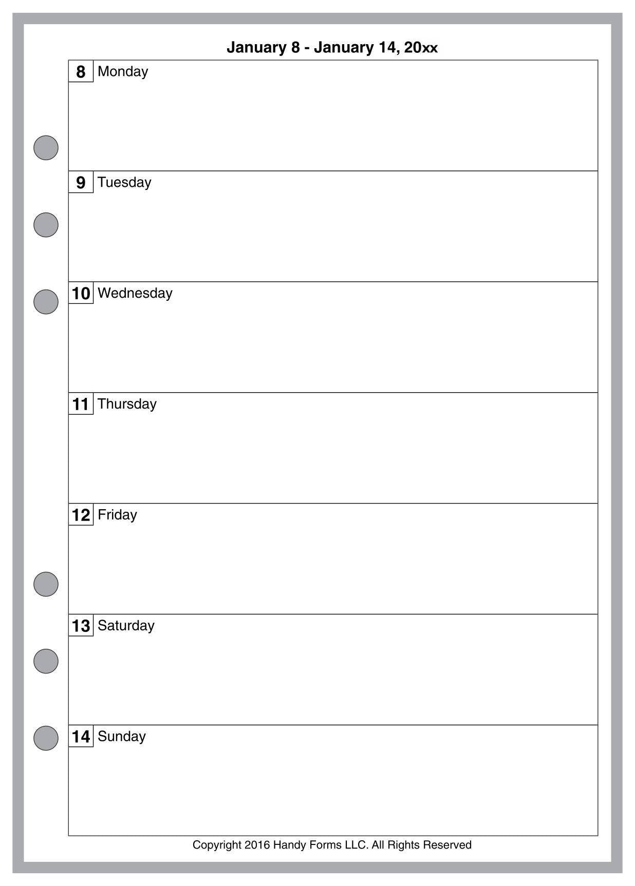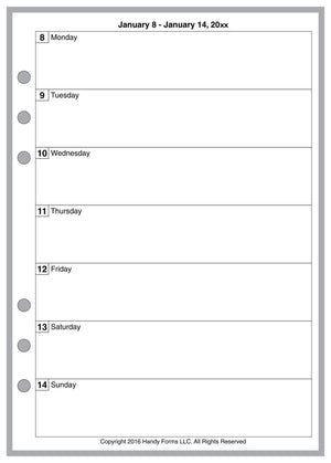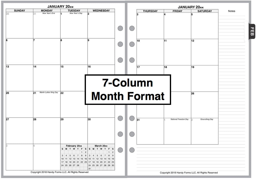 If selected, the monthly spreads are merged with the weekly pages so that the month appears immediately before the weekly pages where the first day of that month occurs. A durable plastic tab is attached to the weekly page just before the month. The monthly pages are available in 3 different formats called 6-column, 7-column, and 8-column. Please see the images for examples.