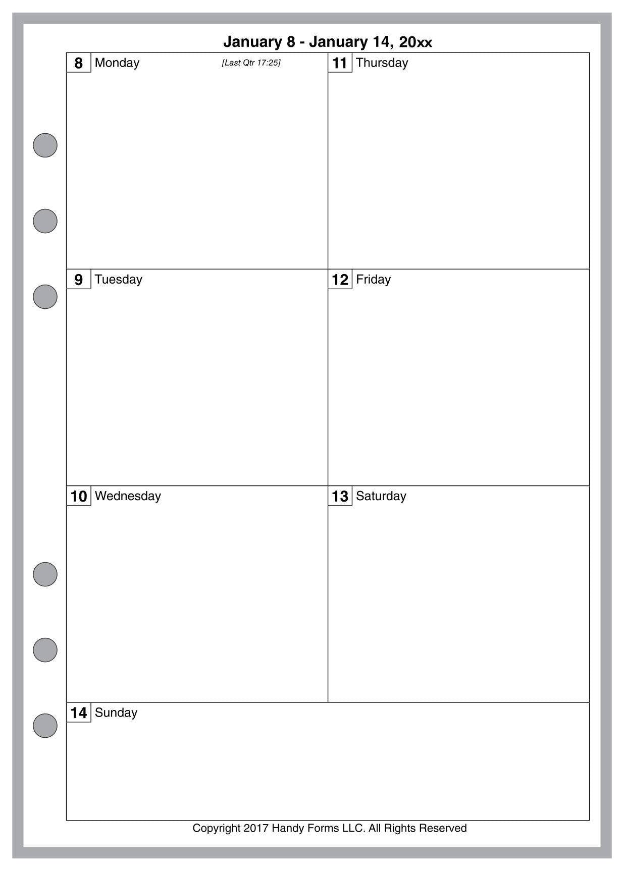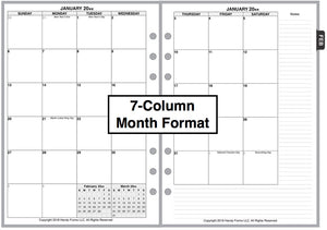 If selected, the monthly spreads are merged with the weekly pages so that the month appears immediately before the weekly pages where the first day of that month occurs. A durable plastic tab is attached to the weekly page just before the month. The monthly pages are available in 3 different formats called 6-column, 7-column, and 8-column. Please see the images for examples.
