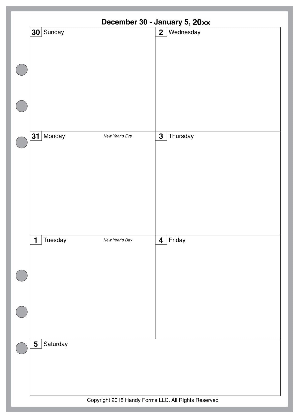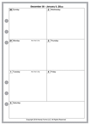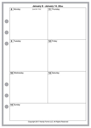 This is a weekly and monthly planner insert for A5 standard size notebooks. Page size is A5 standard, 5.83in x 8.27in (148mm x 210mm). Choose the week start day as Sunday or Monday. Each week is on one page. The daily blocks are arranged vertically with the first 3 days of the week on the left, the next 3 on the right, with the last day across the bottom.