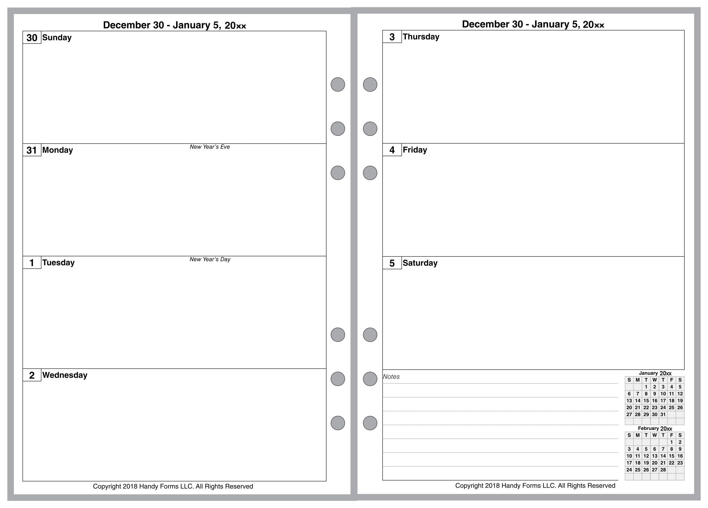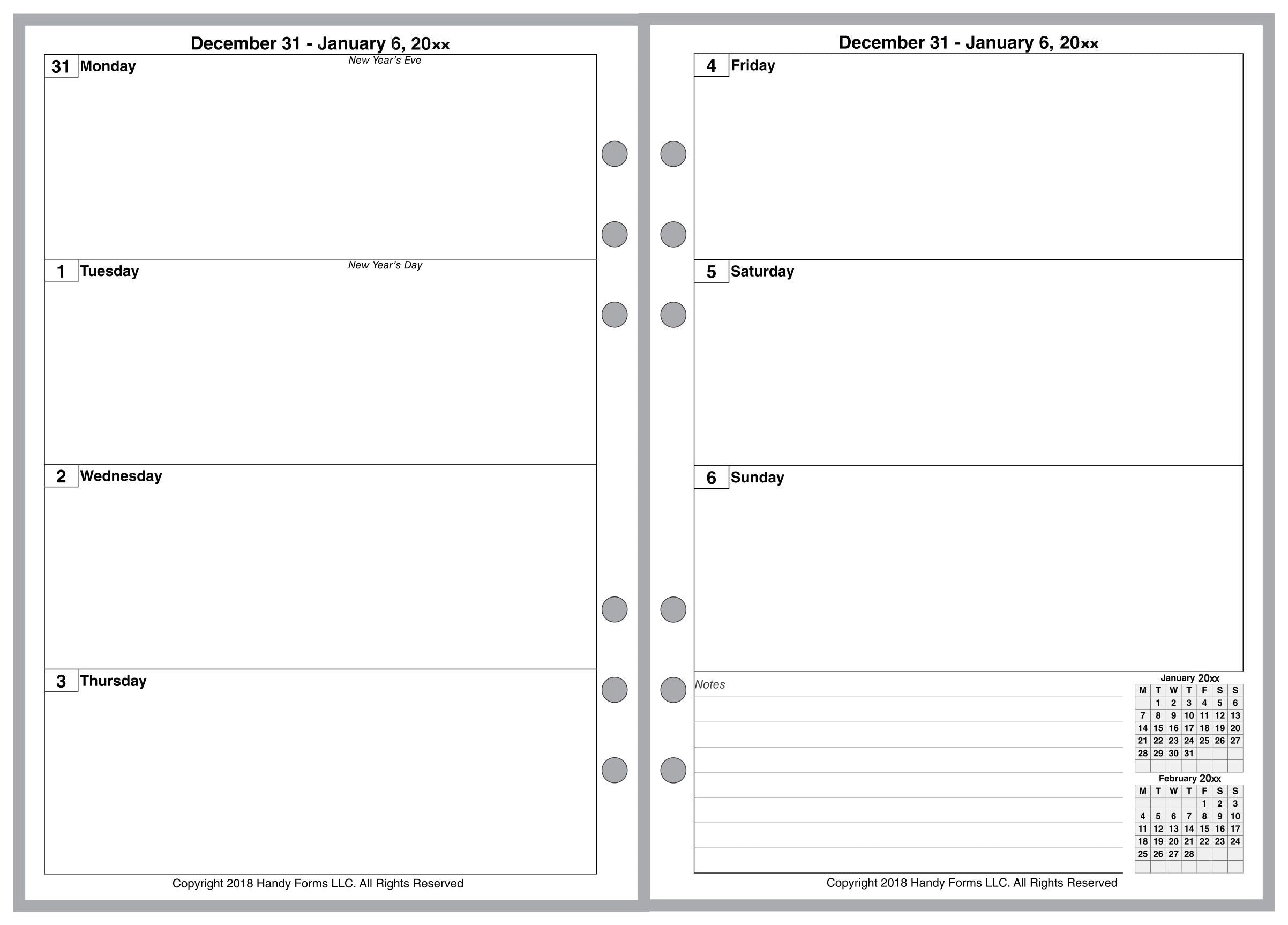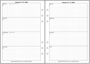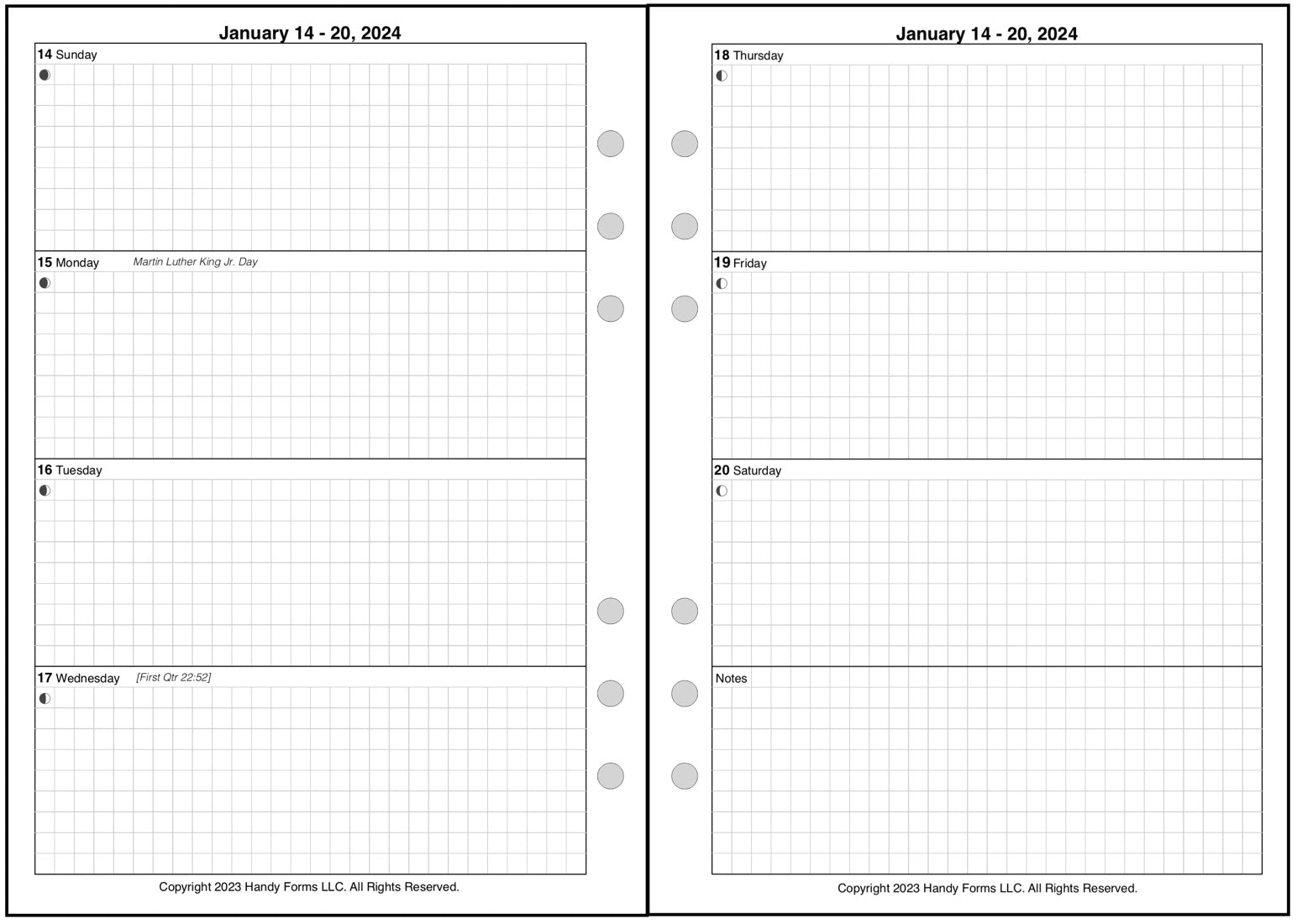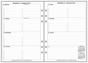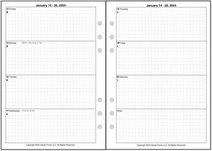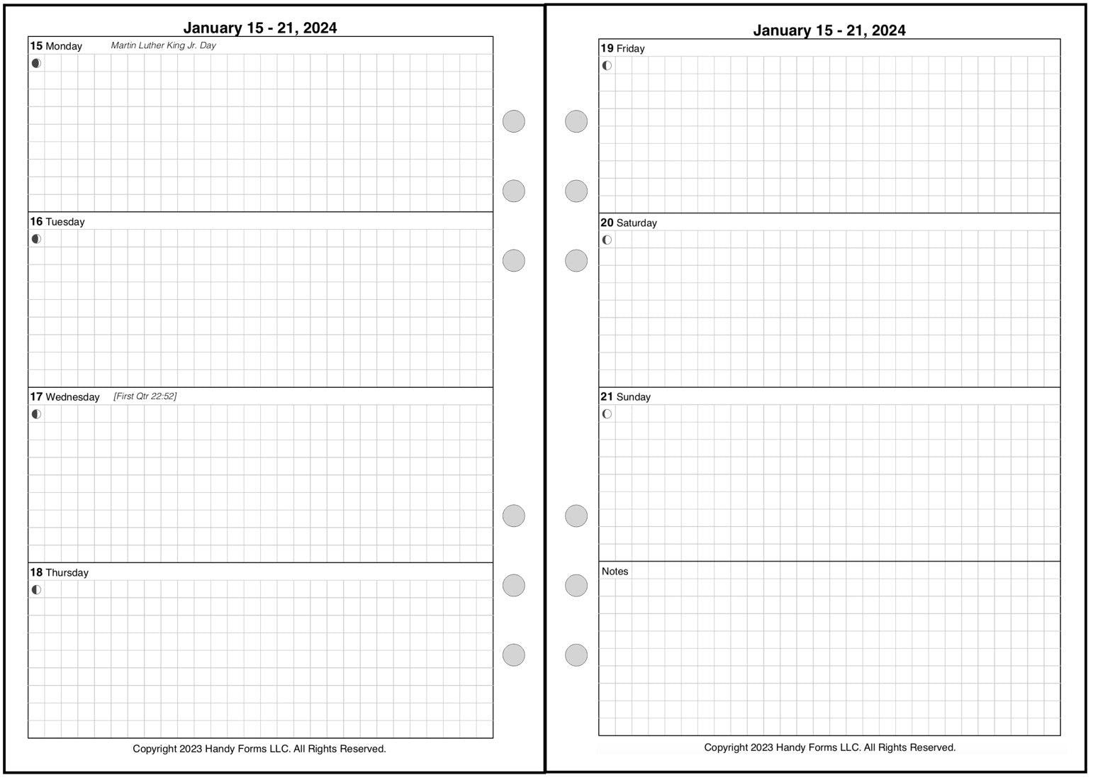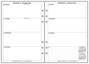 This is a weekly & monthly planner insert for A5 size notebook.. Page size is A5 standard, 5.83in x 8.27in (148mm x 210mm). Each week is on 2 pages. Choose the week start day as Sunday or Monday. The first 4 days of the week are on the left, and the last 3 are on the right, plus space for notes and a mini reference calendar of the current month.