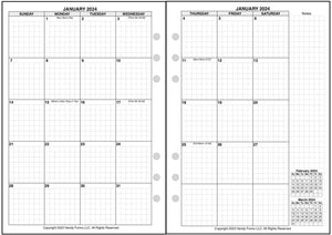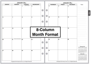 If selected, the monthly spreads are merged with the weekly pages so that the month appears immediately before the weekly pages where the first day of that month occurs. A durable plastic tab is attached to the weekly page just before the month. The monthly pages are available in 3 different formats called 6-column, 7-column, and 8-column. Please see the images for examples.