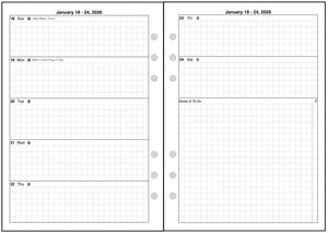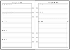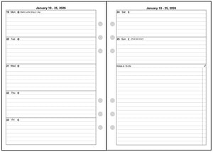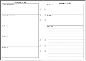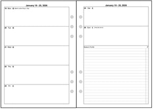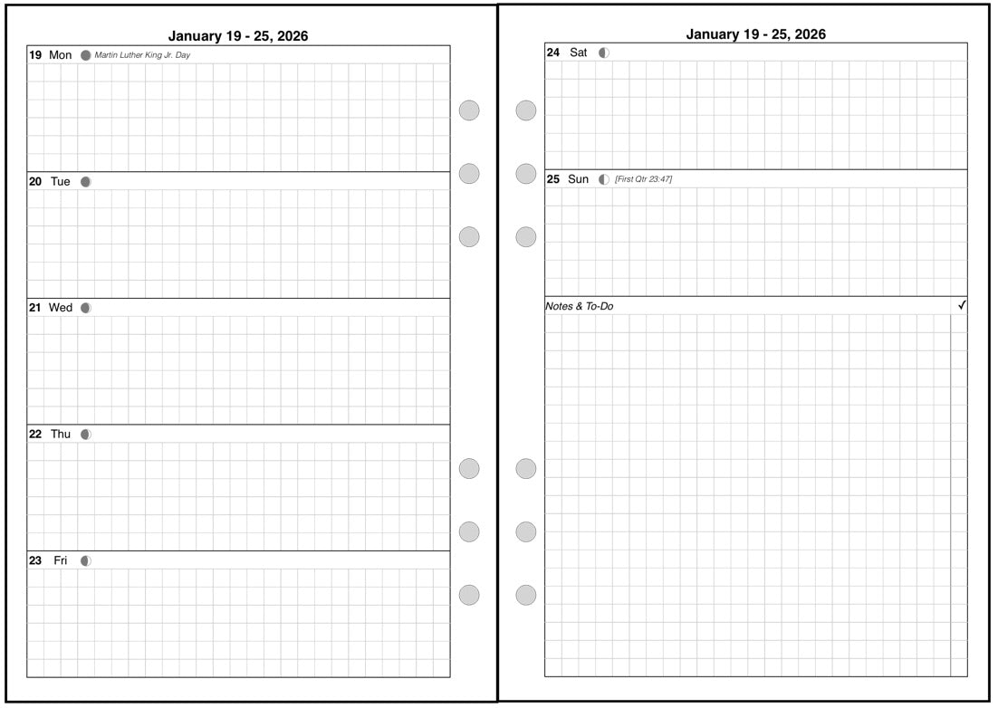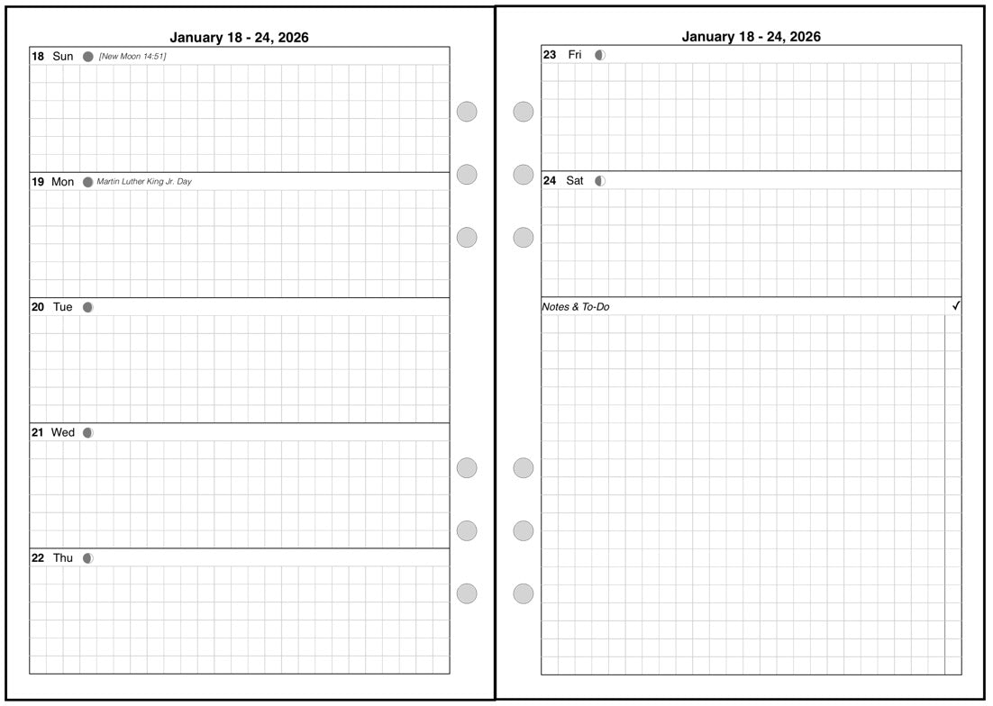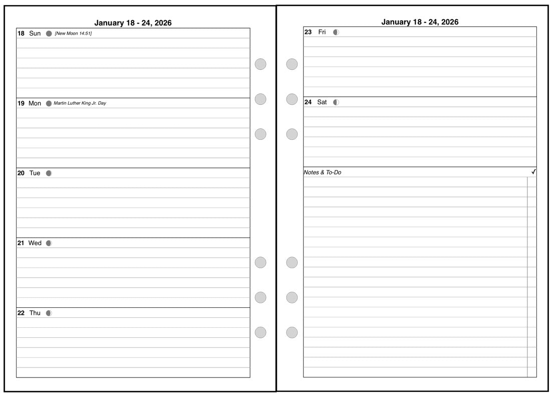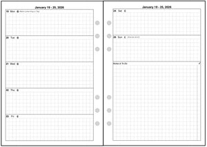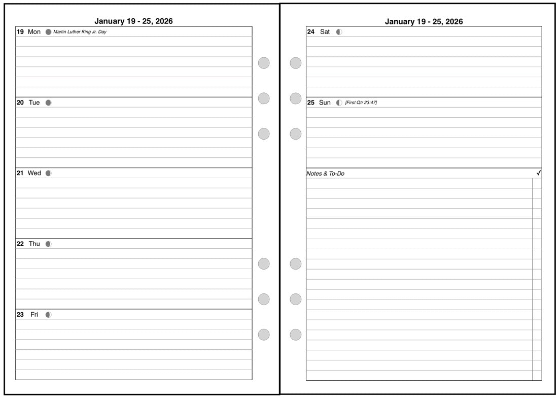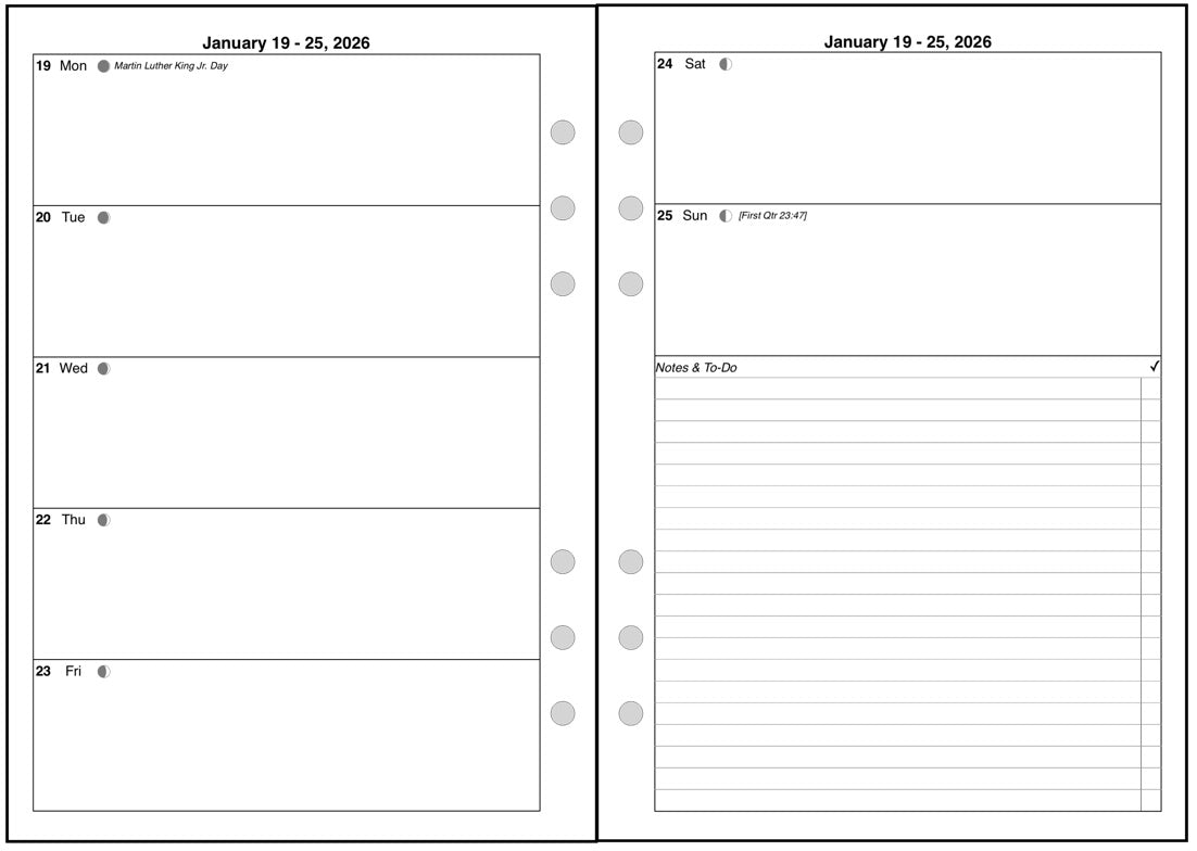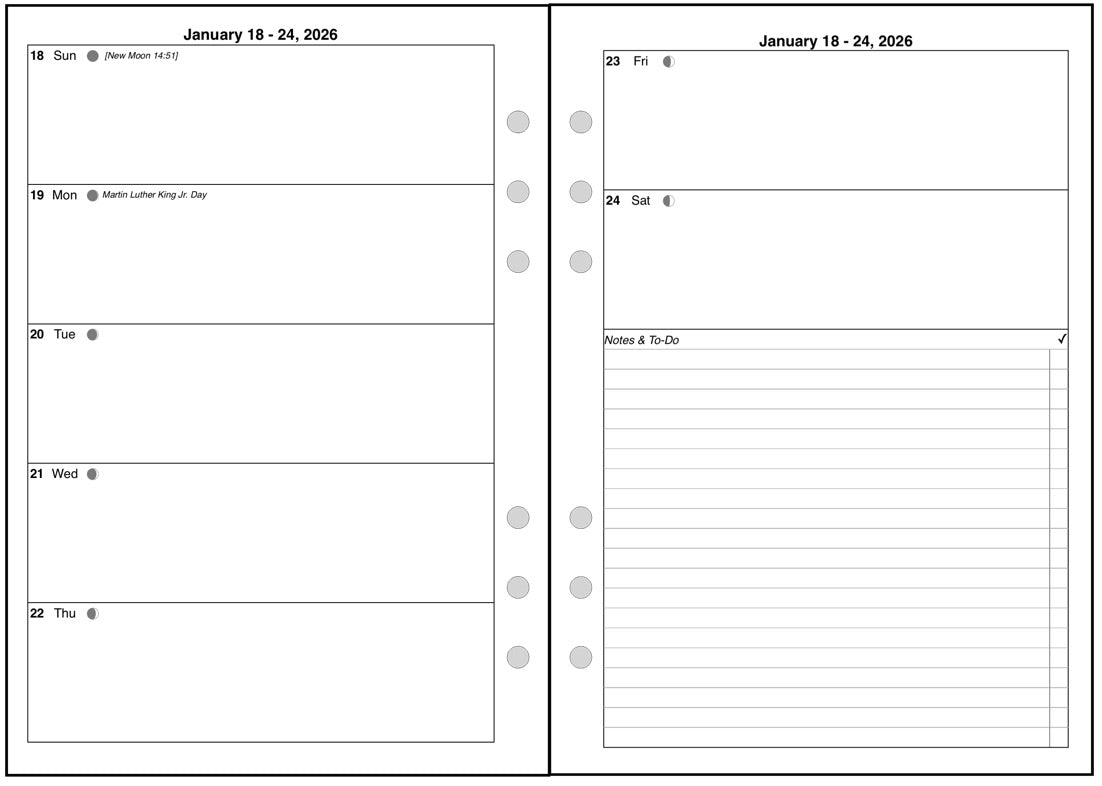 This is a weekly & monthly planner insert for A5 size notebook.. Page size is A5 standard, 5.83in x 8.27in (148mm x 210mm). Choose the week start day as Sunday or Monday. Each week is a 2-page spread. The first 5 days of the week on the left, the last 2 on the right. On the right there are sections for a weekly To-Do list and notes.