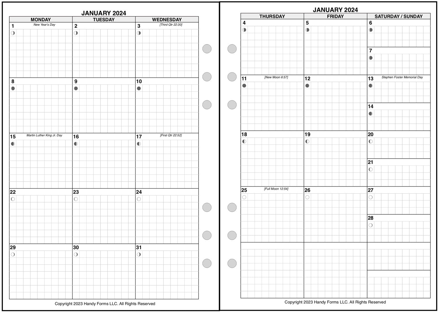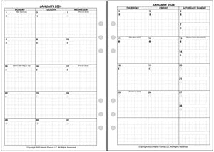 If selected, the monthly spreads are merged with the weekly pages so that the month appears immediately before the weekly pages where the first day of that month occurs. A durable plastic tab is attached to the weekly page just before the month. The monthly pages are available in 3 different formats called 6-column, 7-column, and 8-column. Please see the images for examples.