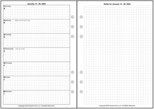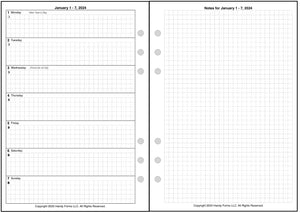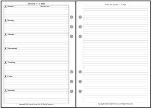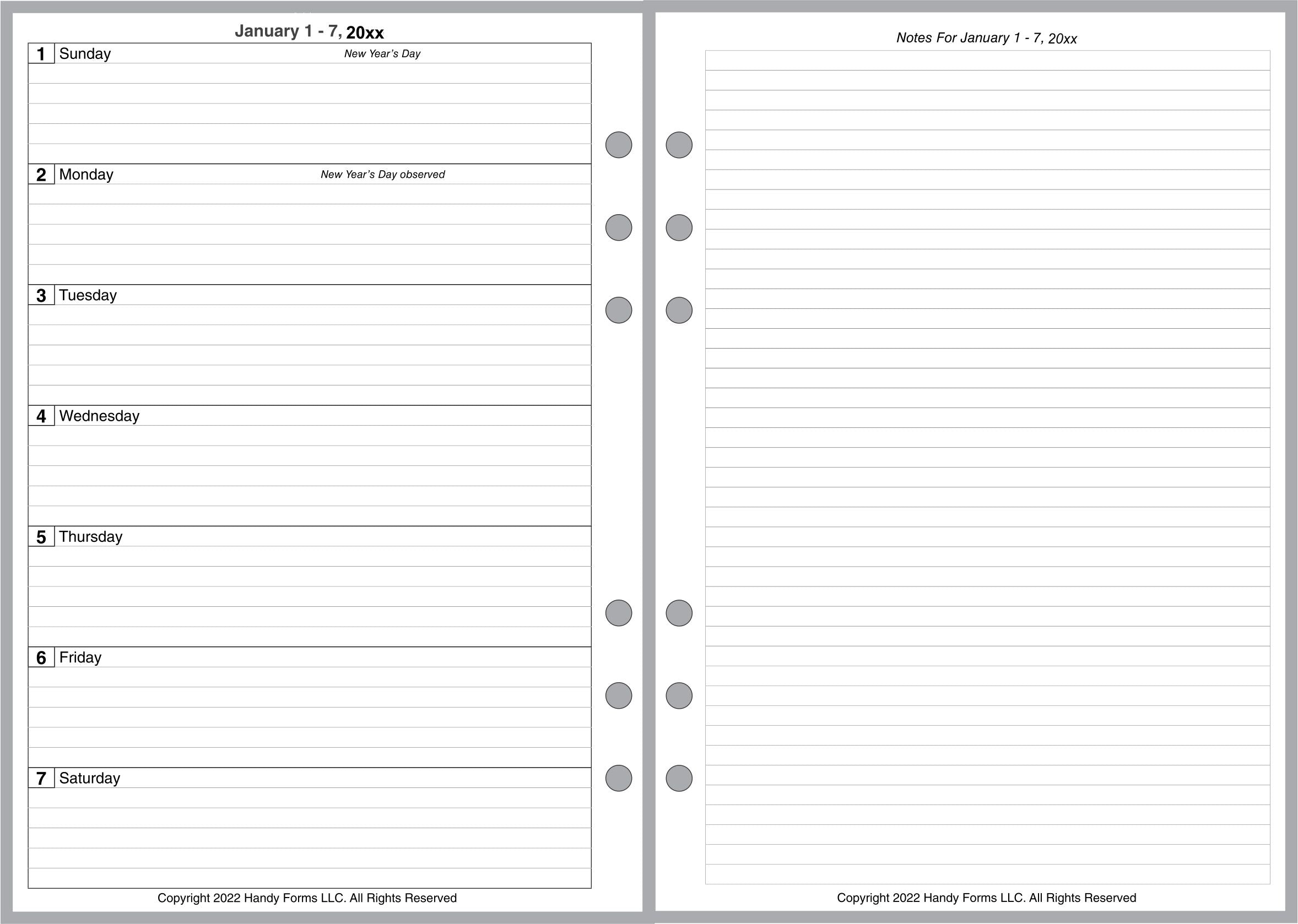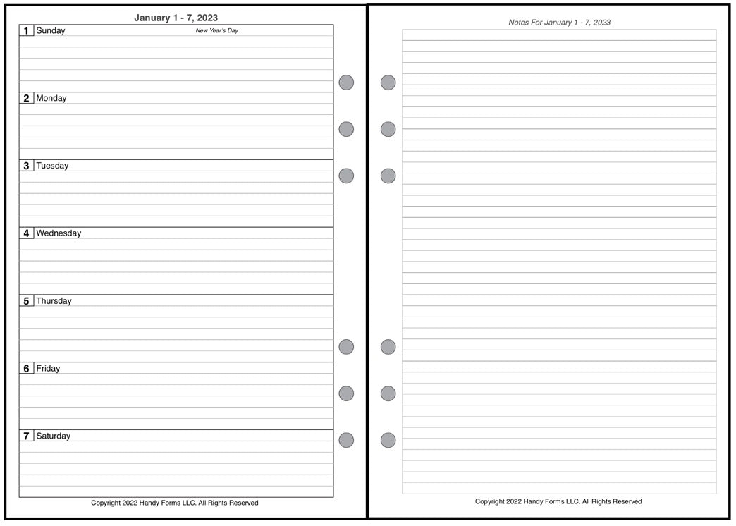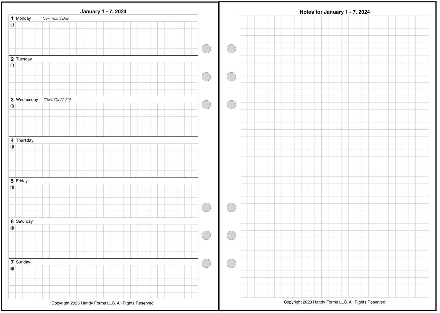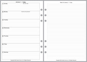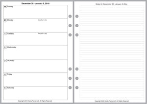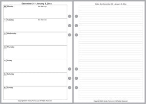 This is a weekly & monthly planner insert for A5 size notebook.. Page size is A5 standard, 5.83in x 8.27in (148mm x 210mm). Choose the week start day as Sunday or Monday. Each week is a 2-page spread. The days of the week on the left. On the right is a page for notes.
