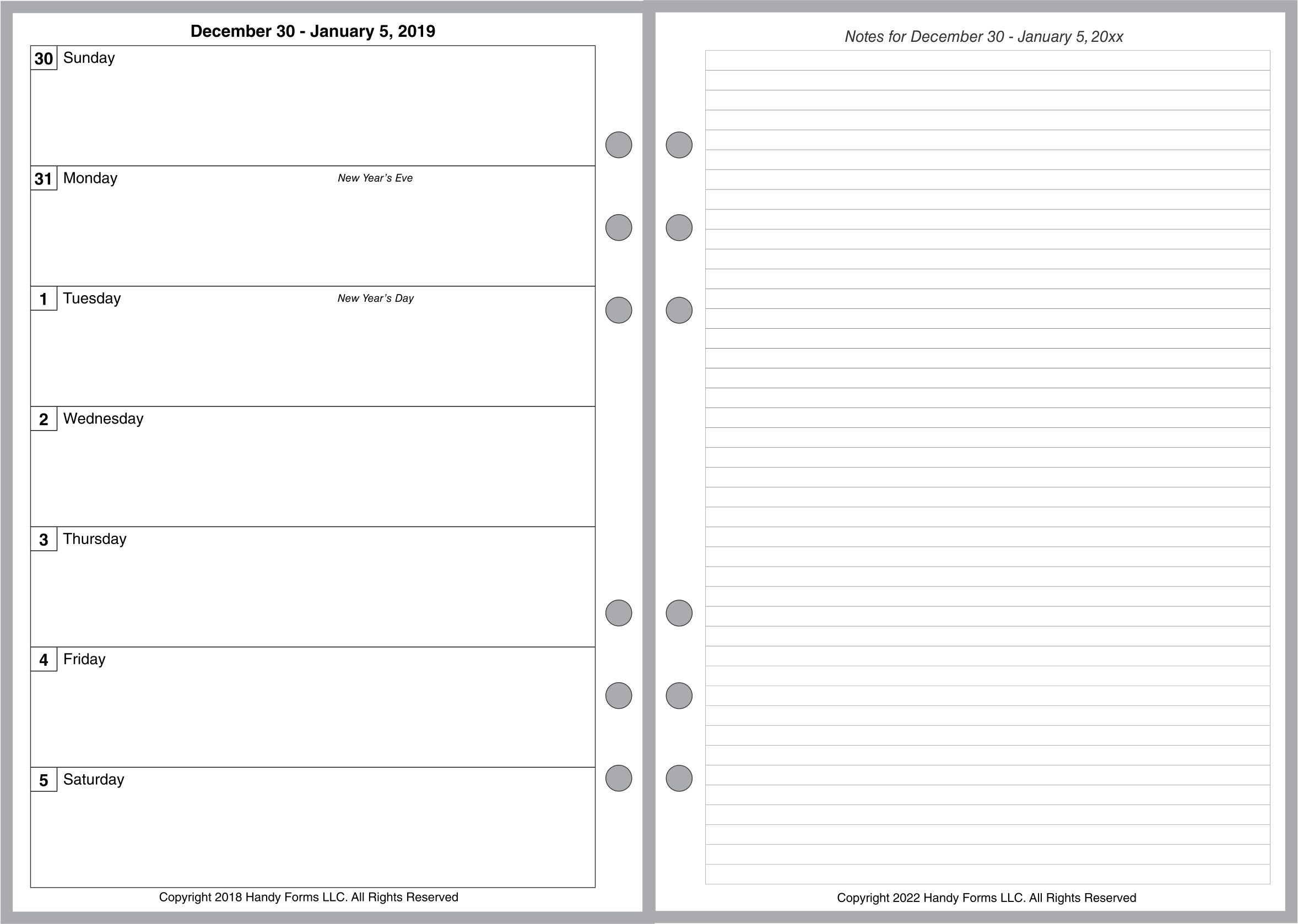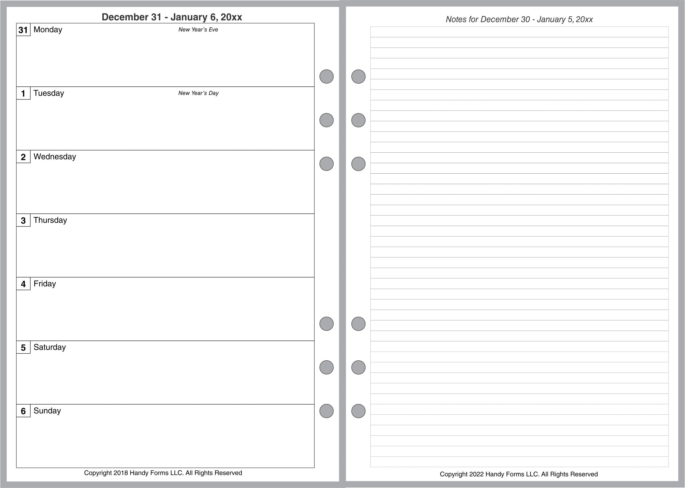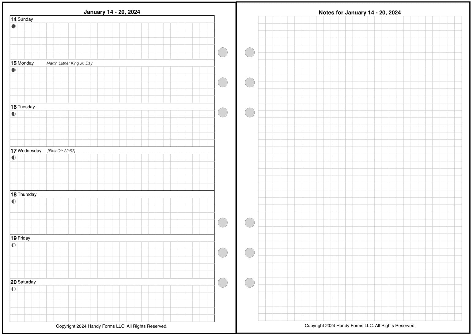 This is a weekly & monthly planner insert for A5 size notebook.. Page size is A5 standard, 5.83in x 8.27in (148mm x 210mm). Choose the week start day as Sunday or Monday. Each week is a 2-page spread. The days of the week on the left. On the right is a page for notes.