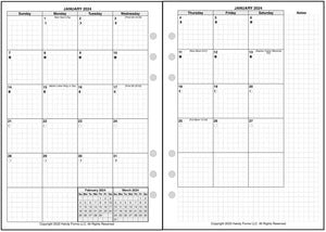 If selected, the monthly spreads are merged with the weekly pages so that the month appears immediately before the weekly pages where the first day of that month occurs. A durable plastic tab is attached to the weekly page just before the month. The monthly pages are available in 3 different formats called 6-column, 7-column, and 8-column. Please see the images for examples.