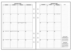 This is a weekly & monthly planner insert for A5 size notebooks. Page size is A5 standard, 5.83in x 8.27in (148mm x 210mm). The week starts with Monday. Each week is a 2-page spread. The days of the week are on the left. Monday through Friday are full width blocks, with Saturday and Sunday half-size at the bottom. On the right is a page for notes.