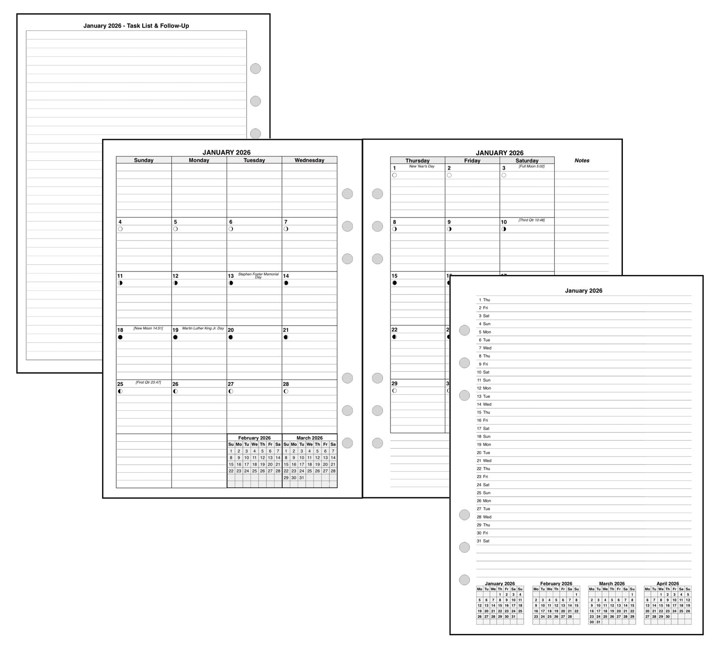 Monthly spreads can be printed back-to-back with nothing separating them, or optionally separated by notes, planning pages, or a monthly habit tracker.