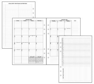 This is a monthly planner insert for A5 size notebooks. Page size is A5 standard, 5.83in x 8.27in (148mm x 210mm). The week start is optionally Sunday or Monday. Each month is a 2-page spread. The first 4 days of the week are on the left-hand page, and the last 3 days are on the right, plus an area for notes. Lines are printed in the daily blocks.