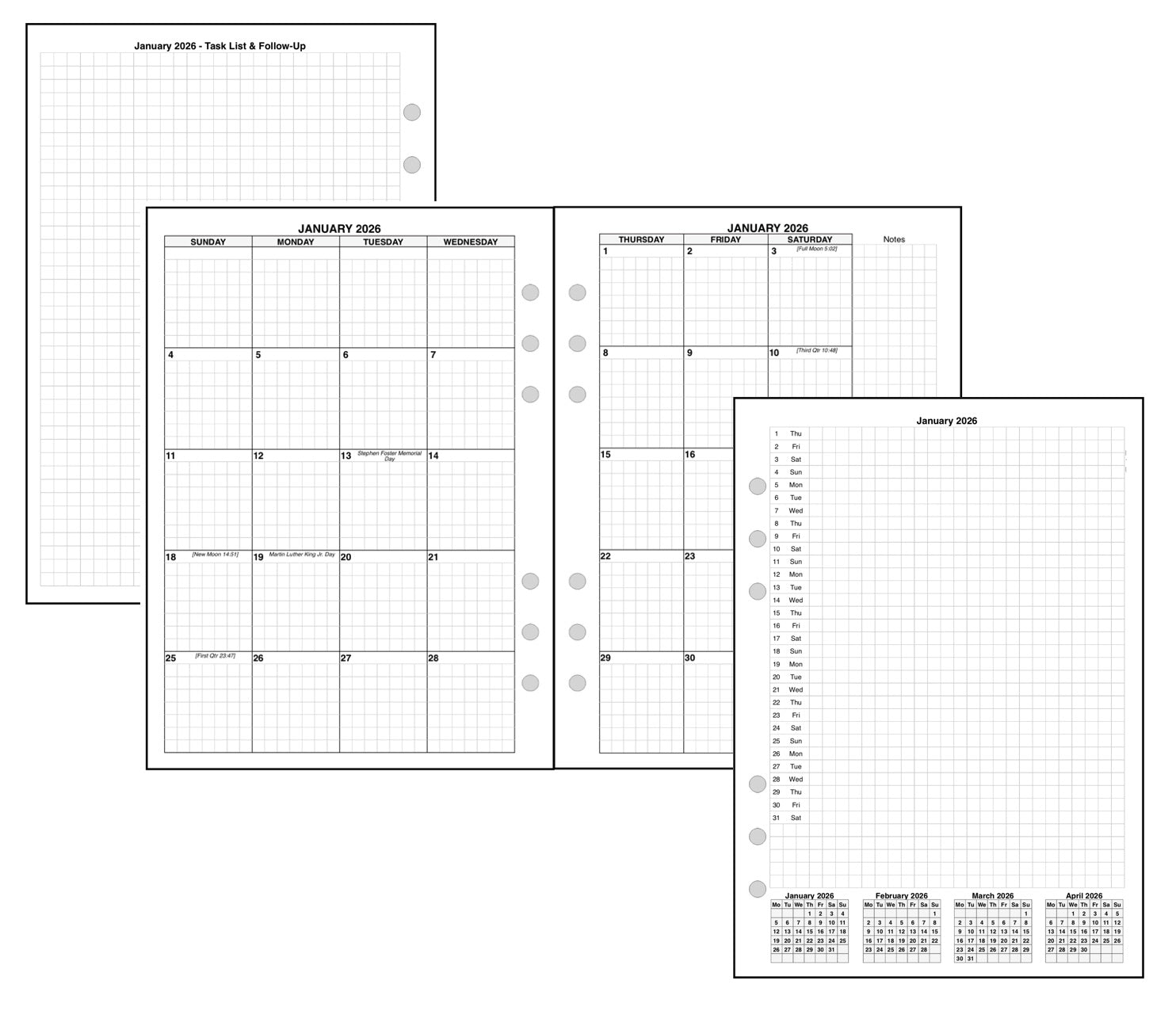 This is a monthly planner insert for A5 size notebooks. Page size is A5 standard, 5.83in x 8.27in (148mm x 210mm). The week start is optionally Sunday or Monday. Each month is a 2-page spread. The first 4 days of the week are on the left-hand page, and the last 3 days are on the right, plus an area for notes. A grid is printed in the daily blocks. This is a 5 week monthly layout, so occasionally the 30th and/or the 31st would fall below the bottom row. When this happens, these dates can be either moved to the first 2 daily blocks in the first row, or these overflow days can share the first 2 blocks of the 5th week.