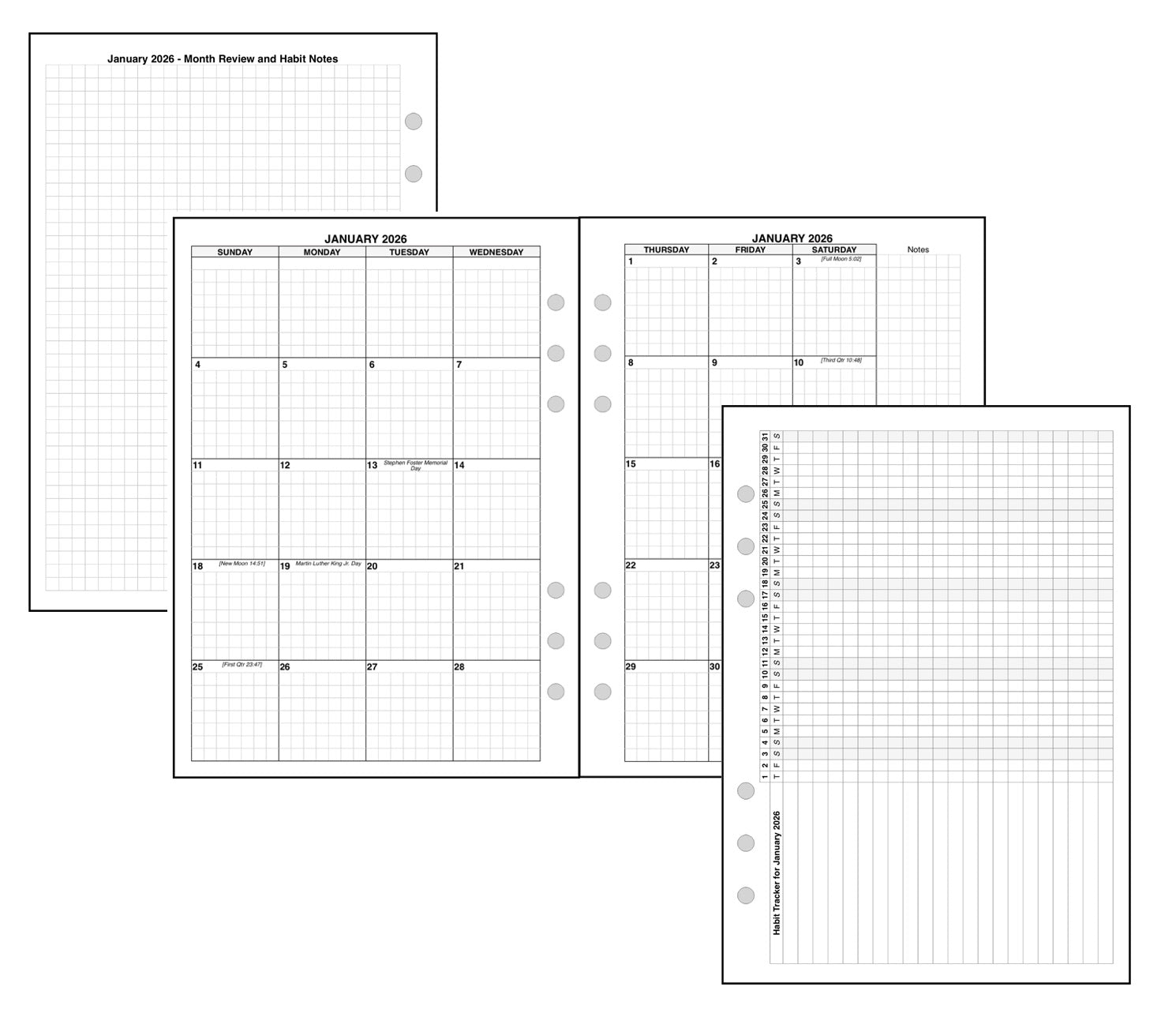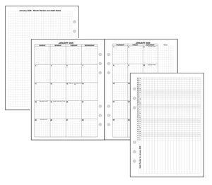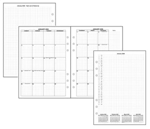 Monthly spreads can be printed back-to-back with nothing separating them, or optionally separated by notes, planning pages, or a monthly habit tracker.