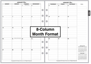 This is a daily and monthly planner insert for A5 size notebooks. The week starts on Sunday or Monday. Each day is on two pages. The page provides appointment time slots from 7:00 am to 8:00 pm plus space for general notes. Also included are 1-page yearly calendars for the current year and next year.