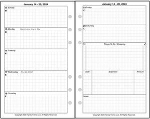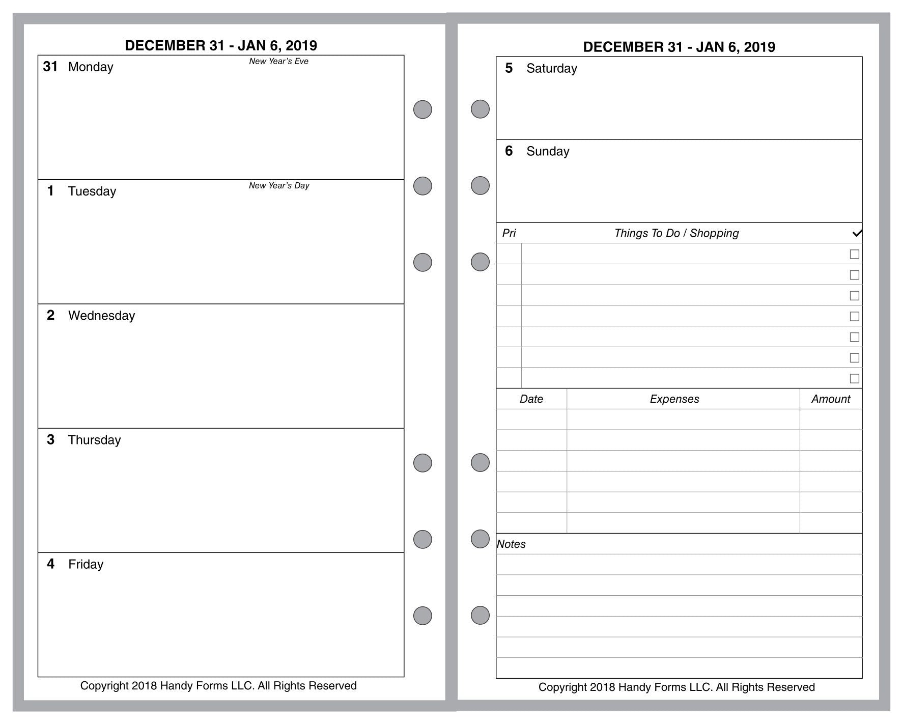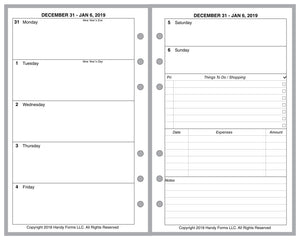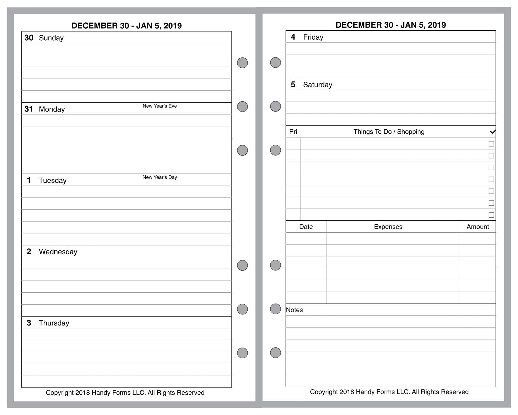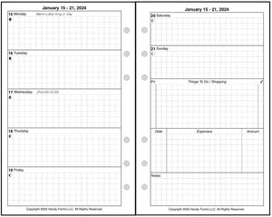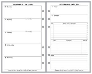 This is a weekly & monthly planner insert for Compact size notebook. Page size is 4-1/4in x 6-3/4in (108mm x 171mm). Choose the week start day as Sunday or Monday. Each week is a 2-page spread. The first 5 days of the week on the left, the last 2 on the right. On the right there are sections for a weekly To-Do list, an expense record, and notes.
