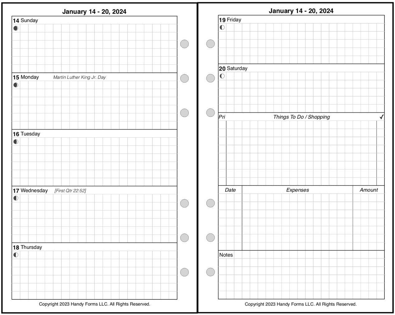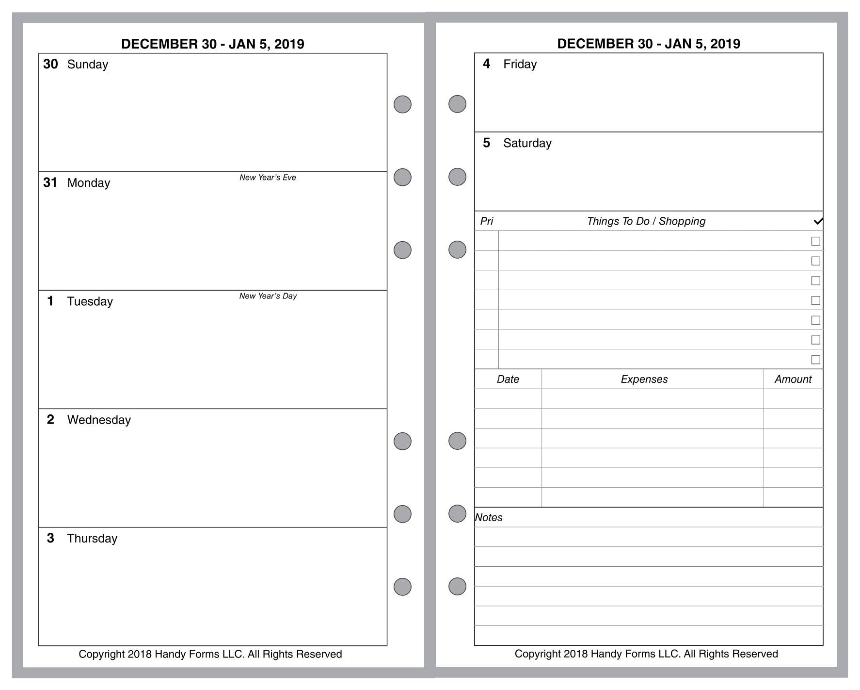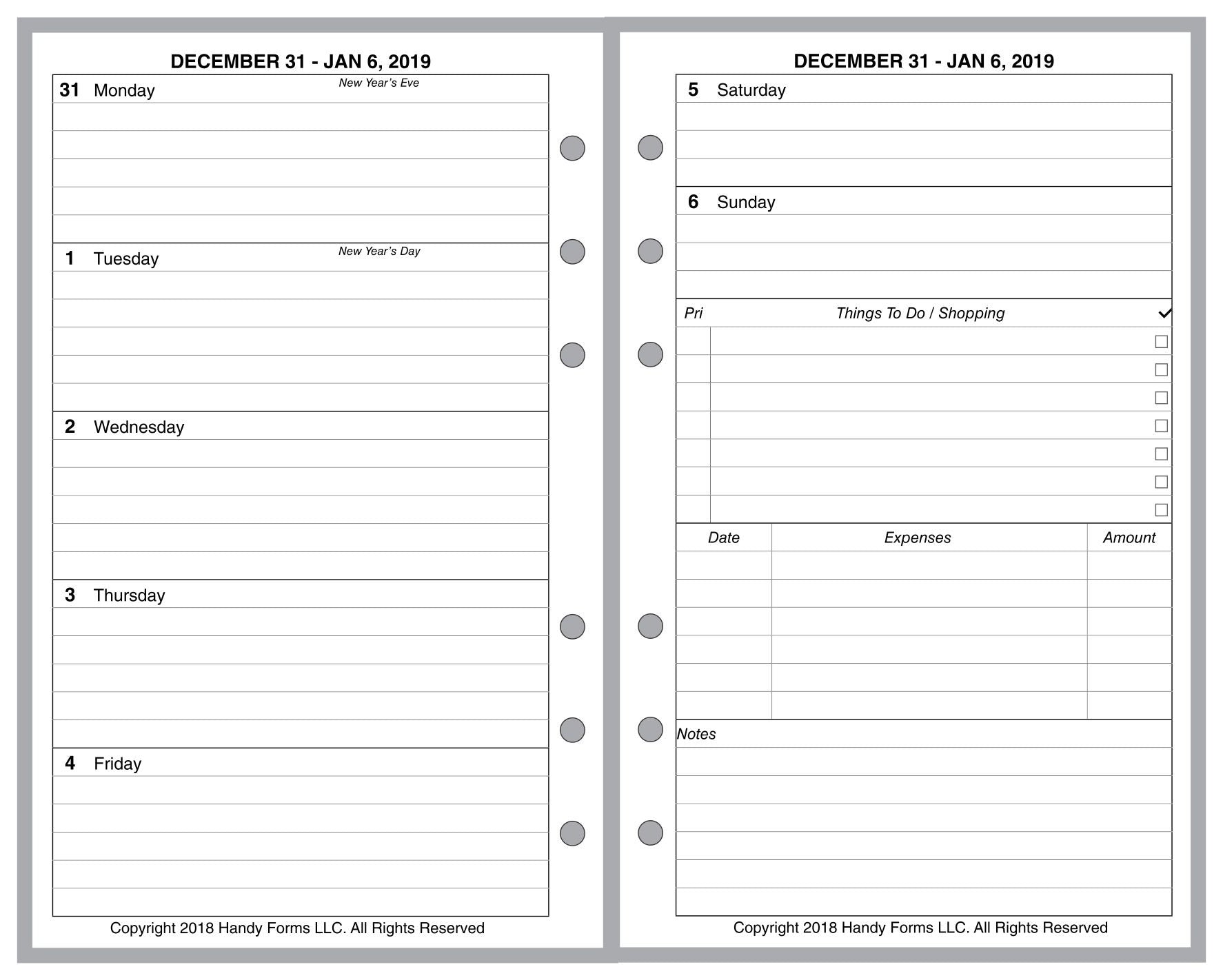 This is a weekly & monthly planner insert for Compact size notebook. Page size is 4-1/4in x 6-3/4in (108mm x 171mm). Choose the week start day as Sunday or Monday. Each week is a 2-page spread. The first 5 days of the week on the left, the last 2 on the right. On the right there are sections for a weekly To-Do list, an expense record, and notes.