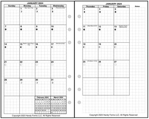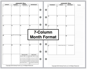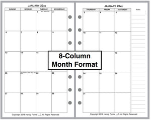 If selected, the monthly spreads are merged with the weekly pages so that the month appears immediately before the weekly pages where the first day of that month occurs. A durable plastic tab is attached to the weekly page just before the month. The monthly pages are available in 3 different formats called 6-column, 7-column, and 8-column. Please see the images for examples.