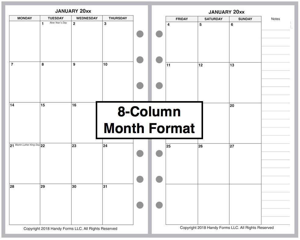 If selected, the monthly spreads are merged with the weekly pages so that the month appears immediately before the weekly pages where the first day of that month occurs. A durable plastic tab is attached to the weekly page just before the month. The monthly pages are available in 3 different formats called 6-column, 7-column, and 8-column. Please see the images for examples.
