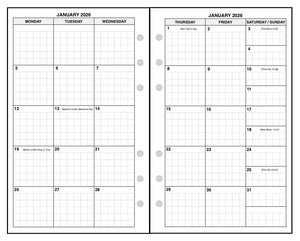 This is a weekly & monthly planner insert for Compact size notebook. Page size is 4-1/4in x 6-3/4in (108mm x 171mm). Choose the week start day as Sunday or Monday. Each day of the week is a vertical column. The first 4 days of the week are on the left, and the last 3 are on the right. The right-hand column is lined for notes. Time slots are printed for 7:00 AM through 7:00 PM on each day. There is a mini reference calendar for the current month at the bottom of the notes column.