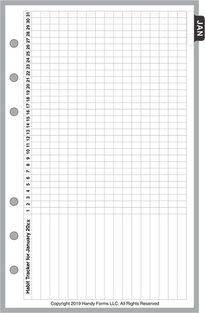 This is a monthly planner and habit tracker insert for the popular Compact size notebooks. Page size is 4-1/4in x 6-3/4in (108mm x 171mm). The week starts with Sunday or Monday. Each month is a 4 pages. The first page is the habit list and daily tracking for the month. Following this page is the 2-page calendar spread for the month with days arranged according to the monthly style (see below). The 4th page is labeled "Month Review and Habit Notes". For 6-column and 8-column styles, if the 30th and/or the 31st would fall below the bottom row of the monthly spread, these dates are moved to the first 2 daily blocks in the first row. Lines are printed in the daily blocks.