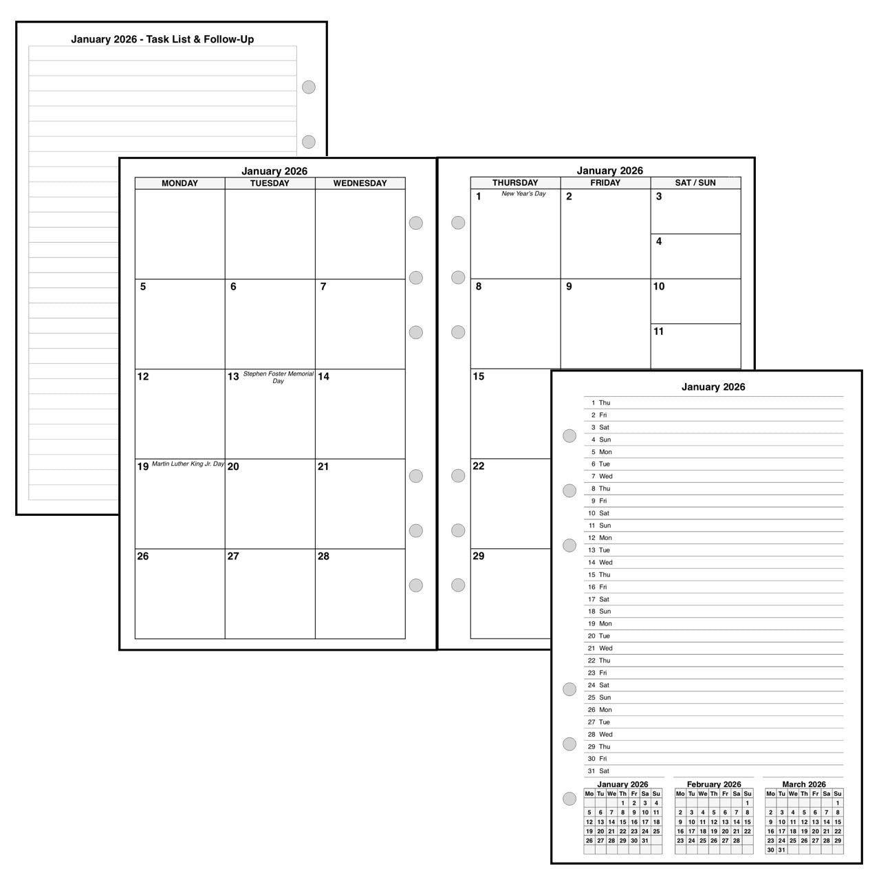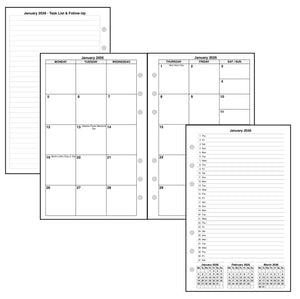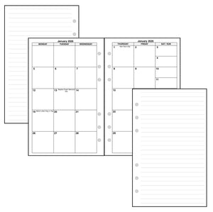 This is a monthly planner insert for the popular Compact size notebooks. Page size is Compact, 4¼" x 6¾" (108mm x 171mm). The week starts with Monday. Each month is a 2-page spread. Monday-Tuesday-Wednesday are on the left-hand page, and Thursday-Friday-Saturday/Sunday are on the right. Saturday and Sunday share the right-hand column. The daily blocks do not have lines. This is a 5 week monthly layout, so occasionally the 30th and/or the 31st would fall below the bottom row. When this happens, these dates can be either moved to the first 2 daily blocks in the first row, or these overflow days can be printed in the Monday-Tuesday blocks in the 5th week.