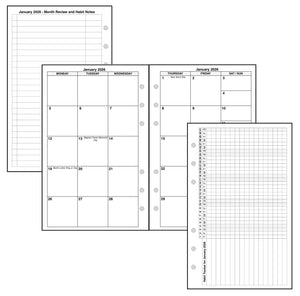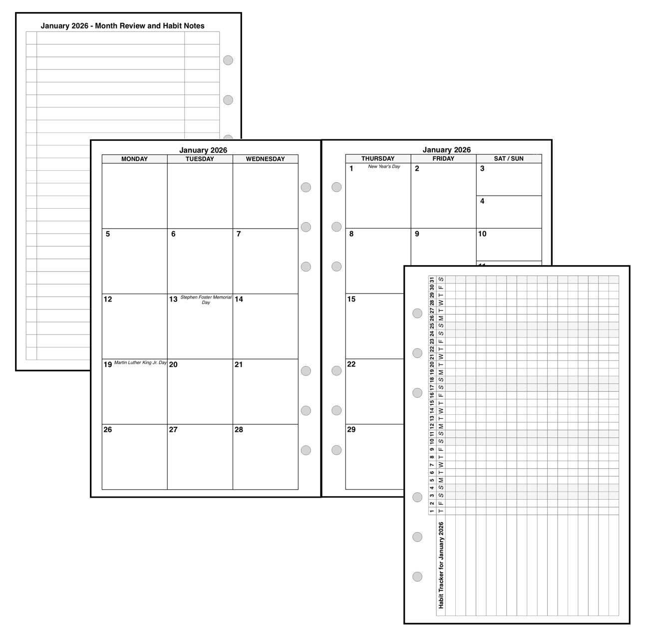 Monthly spreads can be printed back-to-back with nothing separating them, or optionally separated by notes, planning pages, or a monthly habit tracker.