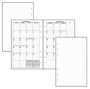 This is a monthly planner insert for Compact size notebooks. Page size is Compact, 4¼" x 6¾" (108mm x 171mm). The week start is optionally Sunday or Monday. Each month is a 2-page spread. The first 4 days of the week are on the left-hand page, and the last 3 days are on the right, plus an area for notes. Lines are printed in the daily blocks.