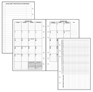 This is a monthly planner insert for Compact size notebooks. Page size is Compact, 4¼" x 6¾" (108mm x 171mm). The week start is optionally Sunday or Monday. Each month is a 2-page spread. The first 4 days of the week are on the left-hand page, and the last 3 days are on the right, plus an area for notes. The daily blocks do not have lines.