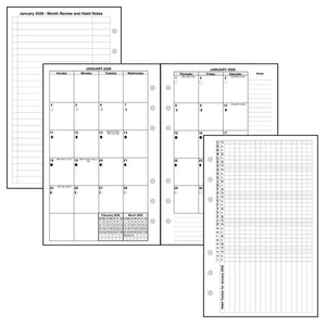 Monthly spreads can be printed back-to-back with nothing separating them, or optionally separated by notes, planning pages, or a monthly habit tracker.