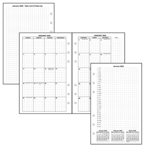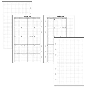 This is a monthly planner insert for Compact size notebooks. Page size is Compact, 4¼" x 6¾" (108mm x 171mm). The week start is optionally Sunday or Monday. Each month is a 2-page spread. The first 4 days of the week are on the left-hand page, and the last 3 days are on the right, plus an area for notes. Lines are printed in the daily blocks. This is a 5 week monthly layout, so occasionally the 30th and/or the 31st would fall below the bottom row. When this happens, these dates can be either moved to the first 2 daily blocks in the first row, or these overflow days can share the first 2 blocks of the 5th week.