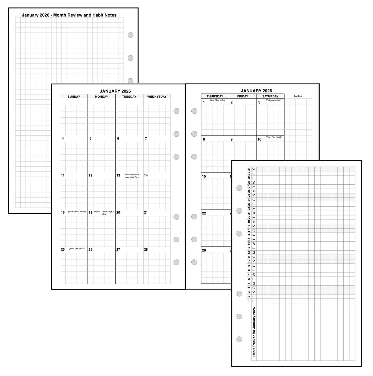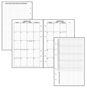 Monthly spreads can be printed back-to-back with nothing separating them, or optionally separated by notes, planning pages, or a monthly habit tracker.