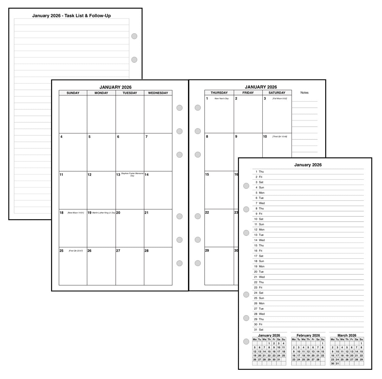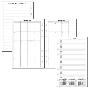 This is a monthly planner insert for Compact size notebooks. Page size is Compact, 4¼" x 6¾" (108mm x 171mm). The week start is optionally Sunday or Monday. Each month is a 2-page spread. The first 4 days of the week are on the left-hand page, and the last 3 days are on the right, plus an area for notes. The daily blocks do not have lines. This is a 5 week monthly layout, so occasionally the 30th and/or the 31st would fall below the bottom row. When this happens, these dates can be either moved to the first 2 daily blocks in the first row, or these overflow days can share the first 2 blocks in the 5th week.