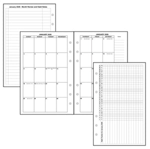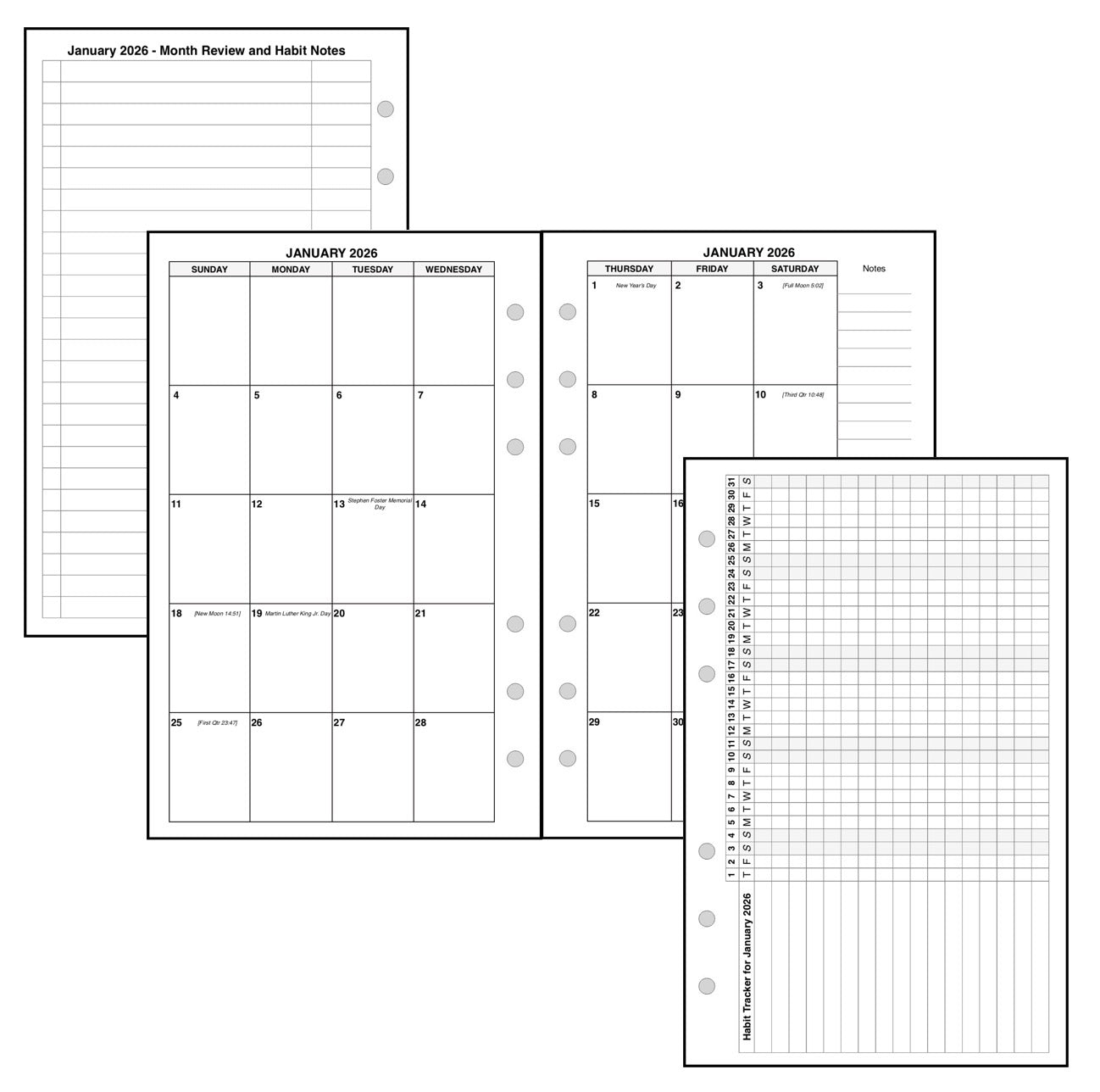 Monthly spreads can be printed back-to-back with nothing separating them, or optionally separated by notes, planning pages, or a monthly habit tracker.
