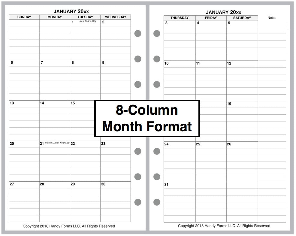 This is a daily and monthly planner insert for the popular Compact size notebooks. Page size is Franklin Compact 4¼" x 6¾" (108mm x 171mm). Choose the week starting day as Sunday or Monday. Each day is on one page, and months are 2-page spreads. Each daily page has appointment slots from 7:00 am to 8:00 pm. In addition there is a column for daily activities and a checklist for things to do. Included are mini calendars for the current and next months.