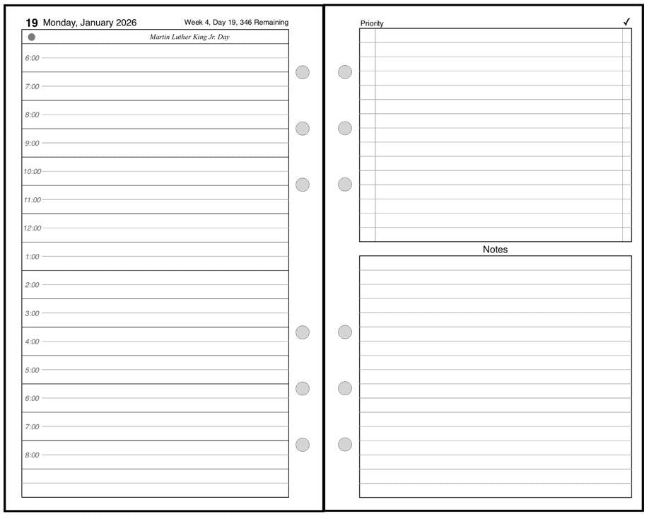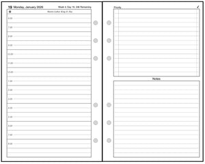 This is a daily and monthly planner insert for the popular Compact size notebooks. Page size is 4-1/4in x 6-3/4in (108mm x 171mm). The week starts on Sunday or Monday. Each day is on two pages. The page provides appointment time slots from 7:00 am to 8:00 pm plus space for general notes. Also included are 1-page yearly calendars for the current year and next year.