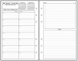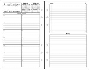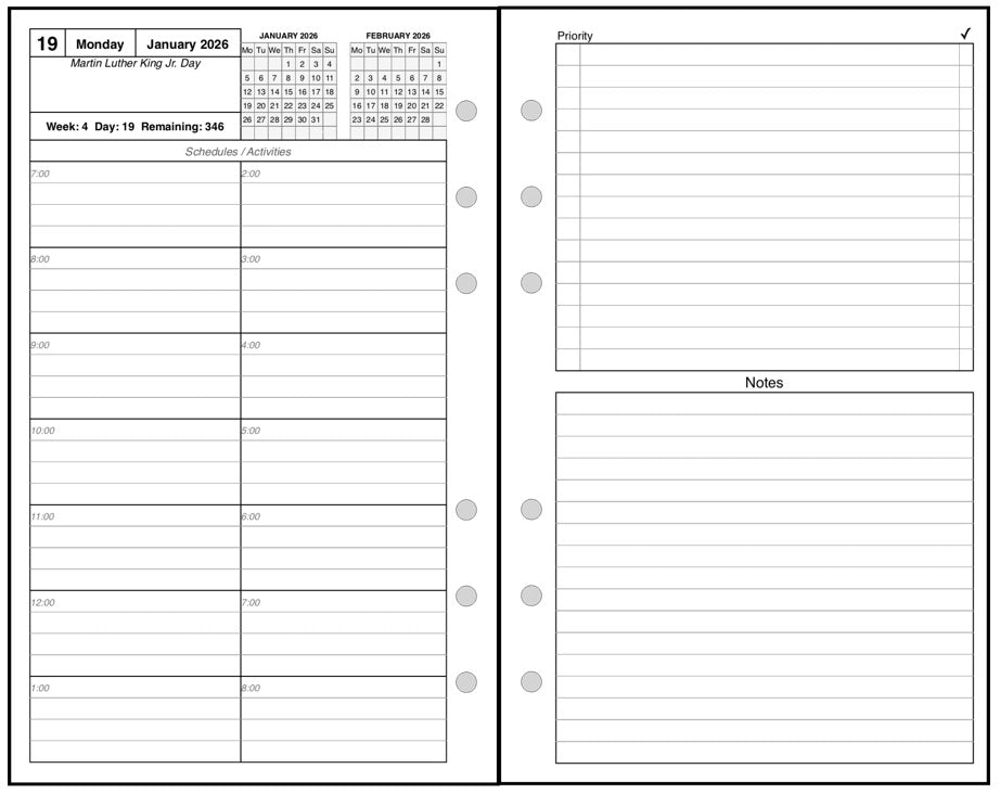 This is a daily and monthly planner insert for the popular Compact size notebooks. Page size is 4-1/4in x 6-3/4in (108mm x 171mm). Choose the week starting day as Sunday or Monday. Each day is on two pages. The hourly appointment blocks are arranged vertically in 2 columns with times from 6:00 am through 7:00 pm. The appointment time range can be changed through customization. Each appointment slot has 4 lines for detailed information. There is also a priority to do list and an area for notes.