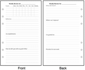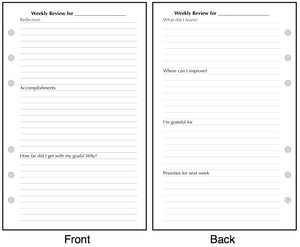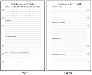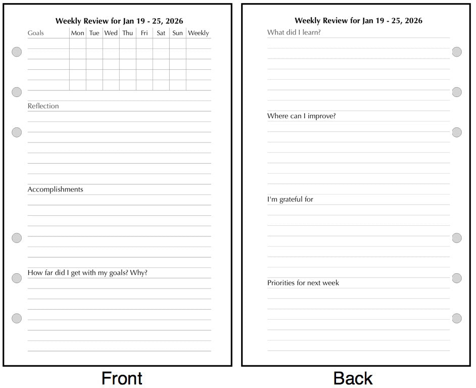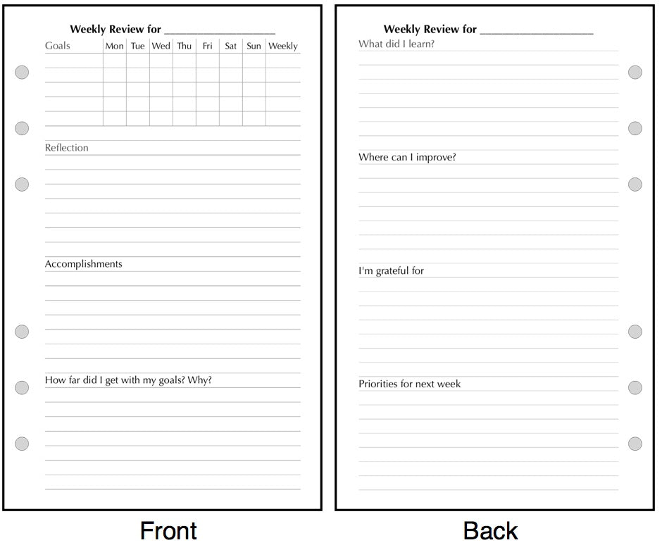 This is a personal development form to review the prior week and reflect on your achievements. It includes your reflections, accomplishments, goals, what you learned, what can be improved, gratitudes, and plans for the coming week. As an option, it can also include a grid for up to 5 goals, to record performance during the week.