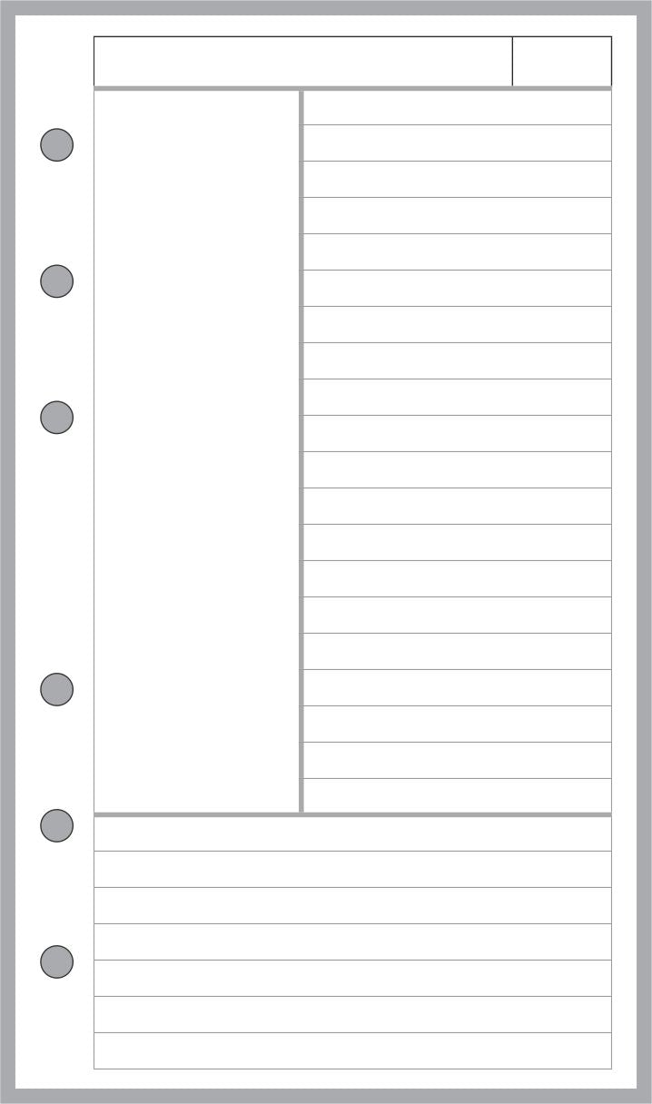 Notes pages for your Franklin Pocket size organizer, specially designed for the Cornell note taking system. This system provides an effective technique to record class notes, meeting notes, and any general record keeping requirement. The top line is for the subject title and date. The right-hand panel is for detailed notes. The left-hand panel is for cues that reference the detailed notes. The bottom panel is for a summary of the details.