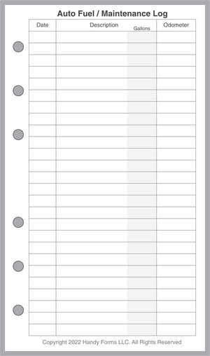 If you like to keep track of your car's fuel, maintenance, and mileage, this planner insert is just the thing. It is sized and punched for the Franklin Pocket size binder. Record the date, description, and odometer reading for any maintenance, new tires, changes, etc. For fuel, write down the date, number of gallons, and the odo reading. In the description area you can keep track of the price per gallon. The back of each page is lined for keeping notes.