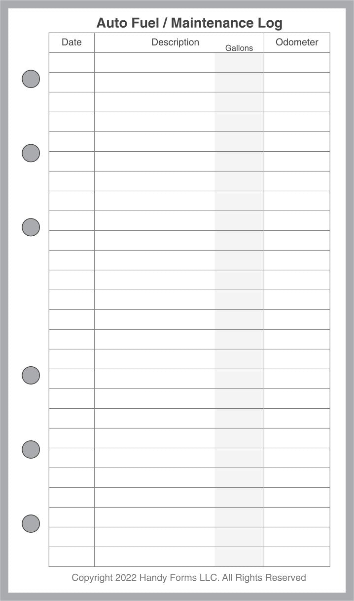 • Auto Fuel / Maintenance Record for the Franklin Pocket size notebook.