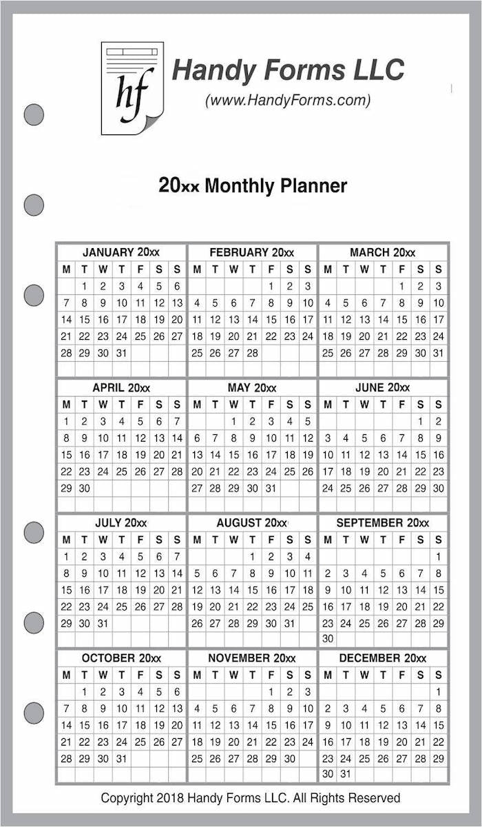 This is a monthly planner insert for the Franklin-Covey pocket size notebooks. Page is Pocket size, 3-1/2in x 6in. The week starts with Sunday or Monday. Each month is a 2-page spread, with a lined note page before and after. The days are arranged according to the style (see below). There are no lines printed in the daily blocks. For 6-column and 8-column styles, if the 30th and/or the 31st would fall below the bottom row, these dates are moved to the first 2 daily blocks in the first row.