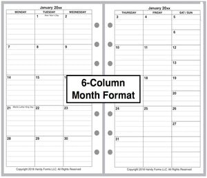 This is a daily and monthly planner insert for the popular Franklin Pocket size notebooks. Page size is Franklin Pocket size 3½" x 6" (89mm x 152mm). Choose the week starting day as Sunday or Monday. Each day is on one page. The hourly appointment blocks are arranged vertically in 2 columns with times from 6:00 am through 7:00 pm. The appointment time range can be changed through customization.