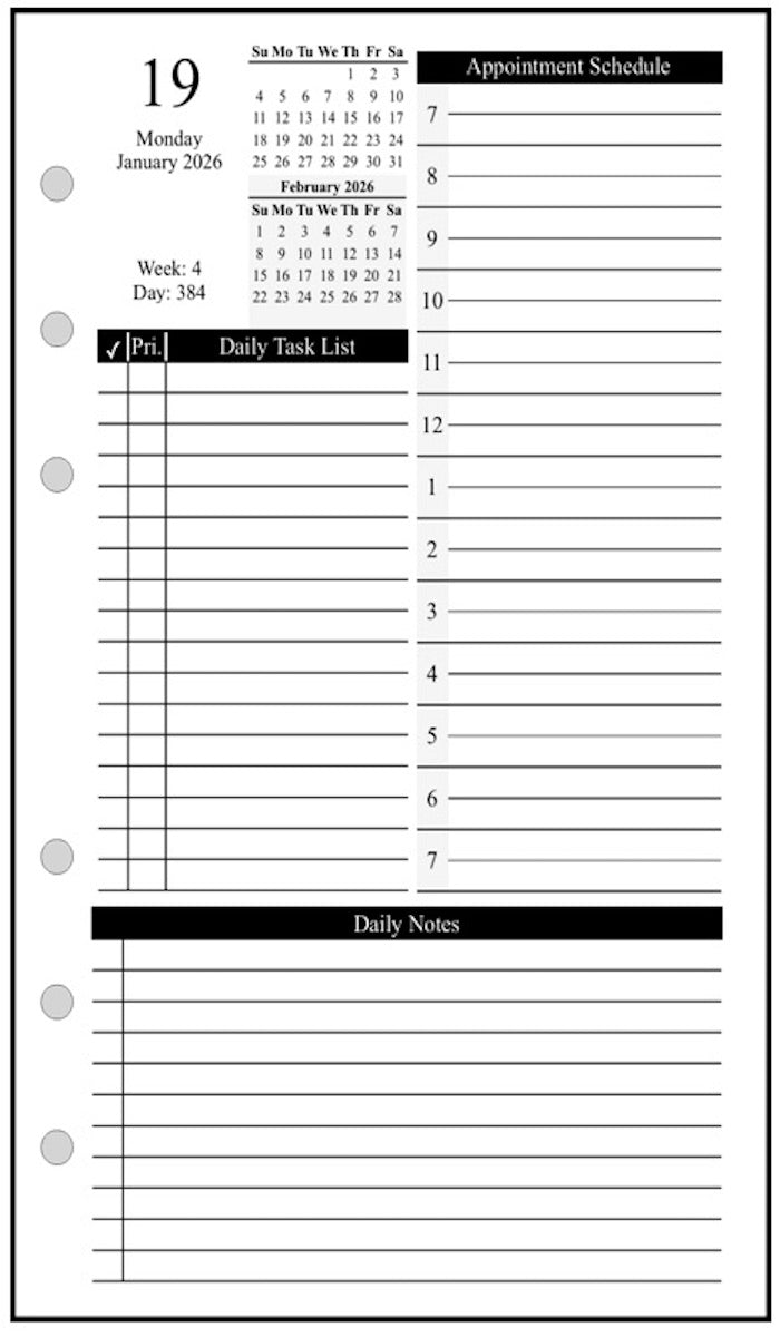 This is a daily and monthly planner insert for the Franklin-Covey pocket size notebooks. Page is Pocket size, 3½ in x 6 in. Choose the week starting day as Sunday or Monday. Each day is on one page. There is a checkmarked section for Daily Tasks, appointment times from 7:00 am to 7:00 pm, and a block for notes.