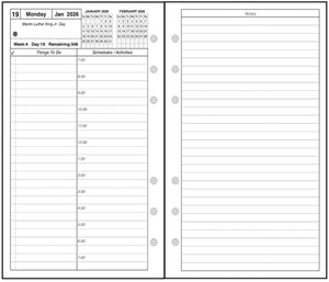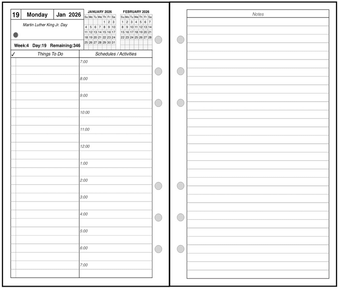 This is a daily and monthly planner insert for the Franklin-Covey pocket size notebooks. Page is Pocket size, 3½ in x 6 in. Choose the week starting day as Sunday or Monday. Each day is on two pages, and months are 2-page spreads. Each daily page has appointment slots from 7:00 am to 8:00 pm. In addition there is a column for activities/schedule, and a checklist for things to do. Included are mini calendars for the current and next months.