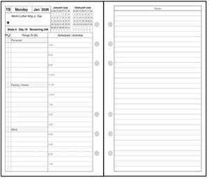 This is a daily and monthly planner insert for the Franklin-Covey pocket size notebooks. Page is Pocket size, 3½ in x 6 in. Choose the week starting day as Sunday or Monday. Each day is on two pages, and months are 2-page spreads. Each daily page has appointment slots from 7:00 am to 8:00 pm. In addition there is a column for daily schedule/activities and a checklist for things to do. The daily activity section is divided into 3 subsections labeled Personal, Family / Home, and Work. The subsection names can be changed through customization. Included are mini calendars for the current and next months.