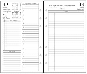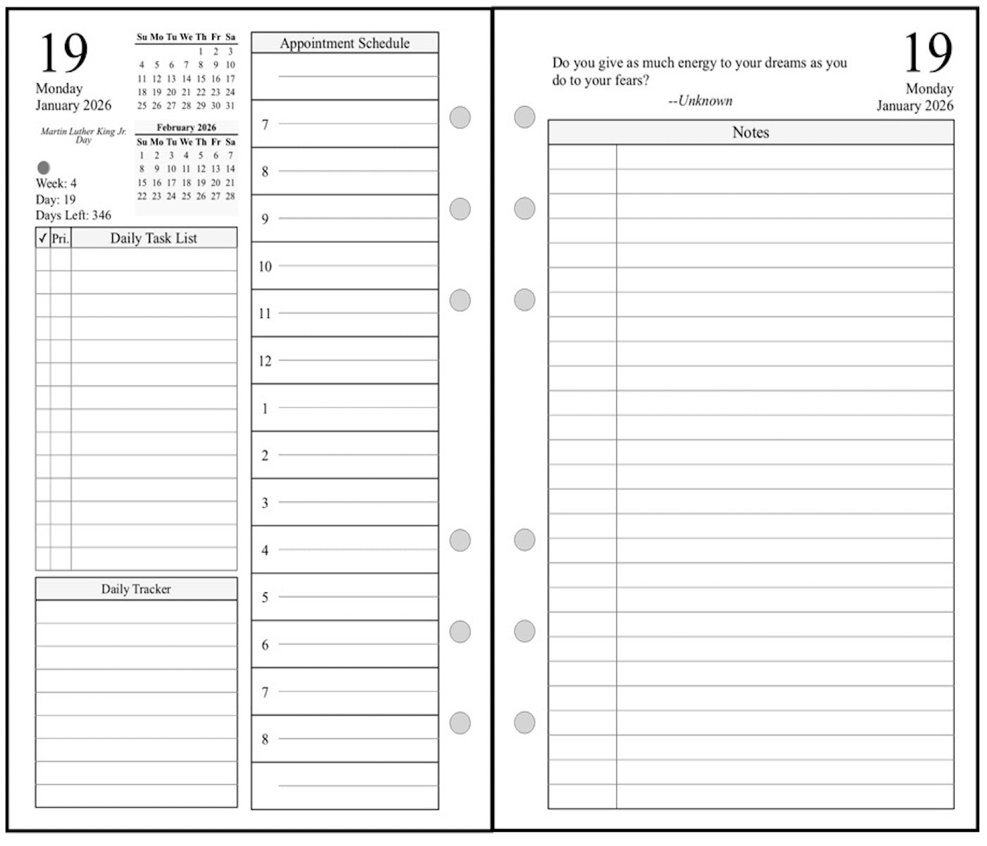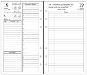 This is a daily and monthly planner insert for the Franklin-Covey pocket size notebooks. Page is Pocket size, 3½ in x 6 in. Choose the week starting day as Sunday or Monday. Each day is on two pages. There is a checkmarked section for Daily Tasks, appointment times from 7:00 am to 8:00 pm, and a block for notes, and a Daily Monitor for tracking such things as expenses and messages. This planner style also includes optional, randomly selected, motivational messages.