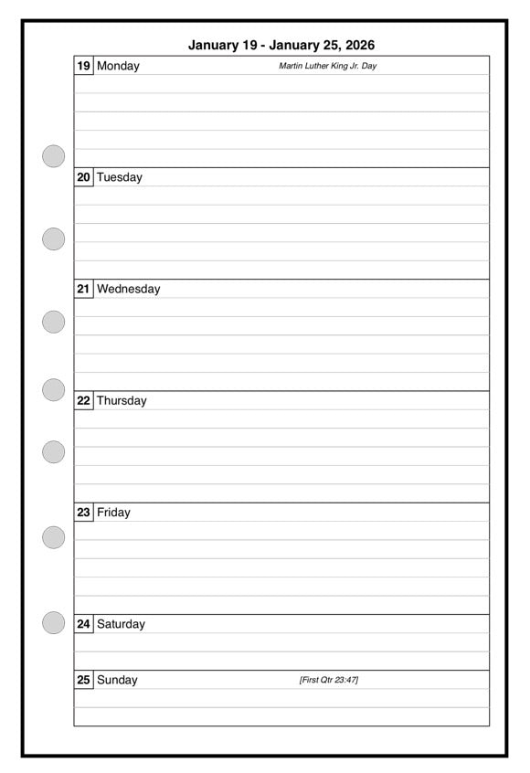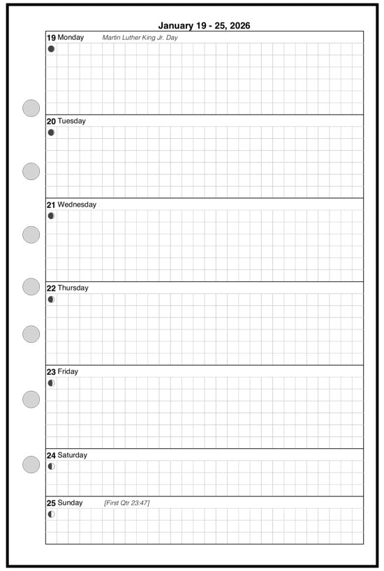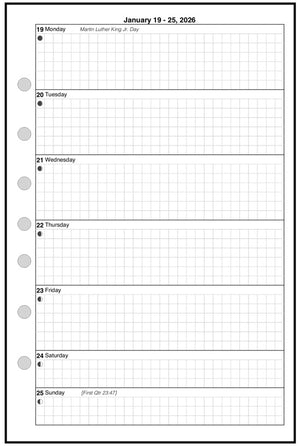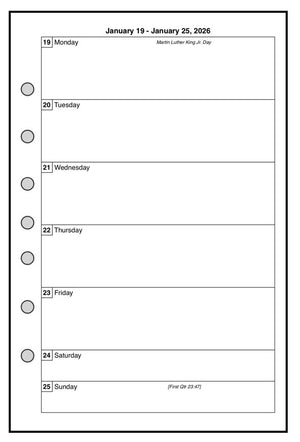 This is a weekly & monthly planner insert for Franklin Classic size notebooks. Page is Franklin Classic size, 5½" x 8½". The week starts with Monday. Monday through Friday are equal size blocks. Saturday and Sunday are half-sized.