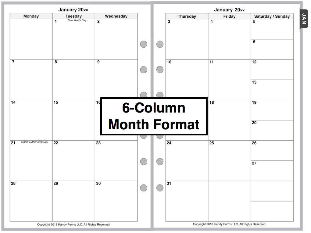 If selected, the monthly spreads are merged with the weekly pages so that the month appears immediately before the weekly pages where the first day of that month occurs. A durable plastic tab is attached to the weekly page just before the month. The monthly pages are available in 3 different formats called 6-column, 7-column, and 8-column. Please see the images for examples.
